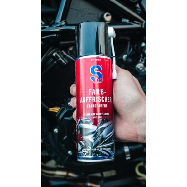 Les couleurs défraîchies retrouveront leur éclat en un clin d’œil grâce à ce raviveur de couleurs S100. Ce produit peut être utilisé sur toutes les surfaces de couleurs comme le plastique et le caoutchouc, mais aussi sur le bloc moteur et les jantes. Le raviveur de couleurs S100 est transparent, il convient donc pour tous les accessoires vernis et non vernis, sans tenir compte du type de matériau. Et les coques de rétroviseurs, les pièces en carbone, cadres, top-cases… connaîtront une seconde vie. Le raviveur de couleurs résiste aux températures, sèche sans laisser de traces et résiste à la pluie et à plusieurs lavages.