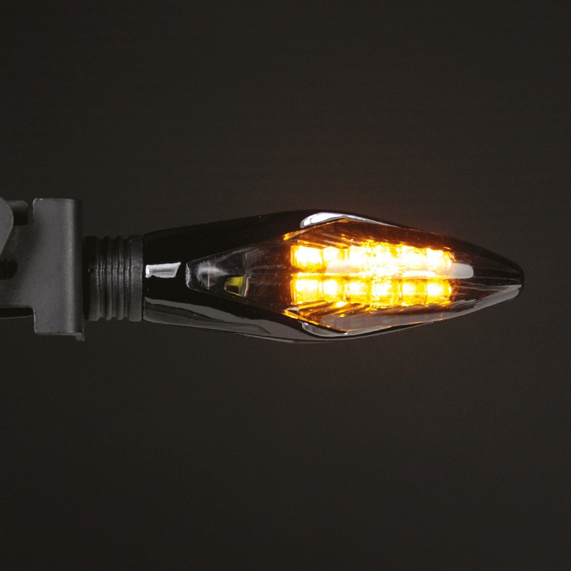 Le CHAFT Dragon au look excentrique exclusif donnera à votre moto une allure unique. Ce clignotant universel est pourvu de lampes à led de 3W et d’un support non flexible. Le boîtier noir est fabriqué en aluminium, la coque est fumée mais les ampoules clignotent orange. Ces clignotants homologués CE sont livrés par paire et sont pourvus d’un câble et d’un écrou.