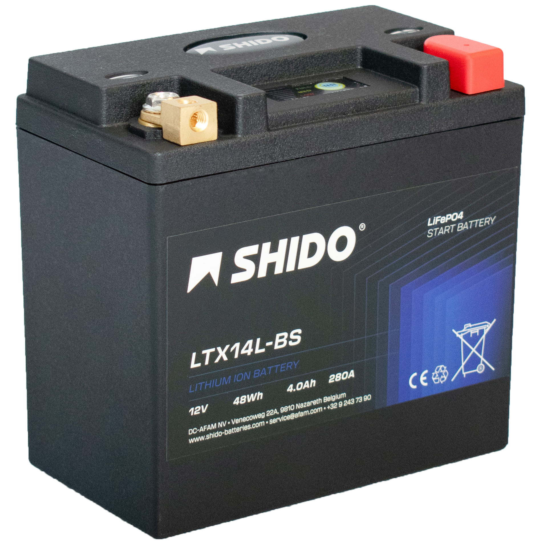 Les batteries Lithium Shido contiennent quatre cellules lifePO4 connectées en série (Lithium Iron Phosphate) de 3,2 volt chacune. Ensemble elles délivrent une puissance de 12,8 volts, parfaite comme batterie de démarrage d’une moto. Le système de gestion de la batterie (BMS) divise la charge uniformément dans les quatre cellules. Grâce à une petite résistance intégrée, cette batterie au Lithium peut générer une très haute capacité de démarrage. Puissante et rapide en d’autres mots. L’état de la batterie peut à tout moment être contrôlé au moyen d’un bouton poussoir.