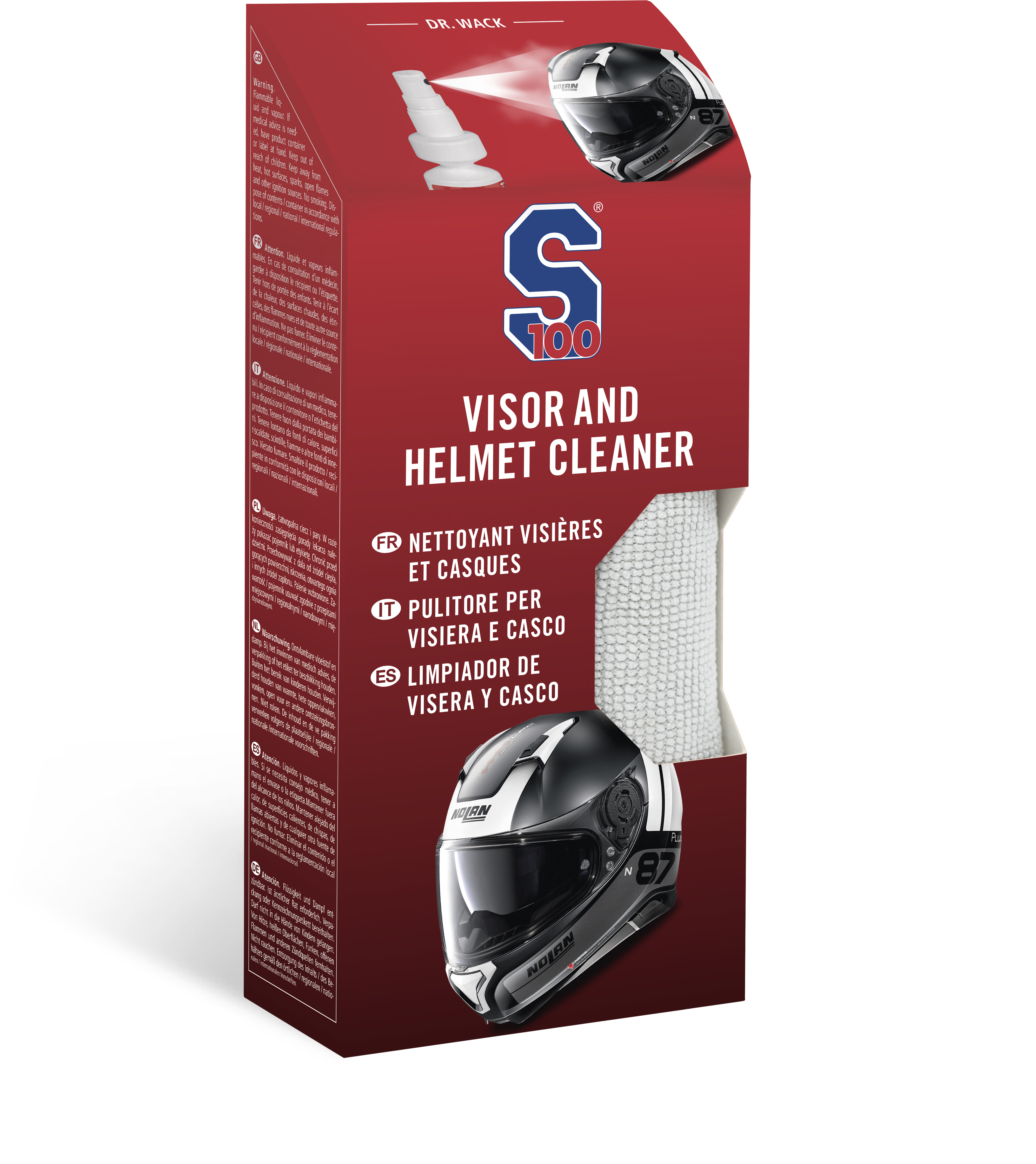 Le nettoyant pour visière et pour casque S100 rend à votre visière et votre casque toute sa beauté en un clin d’œil. Un coup de spray, frotter avec le chiffon en microfibre et le tour est joué ! Même les insectes venus s’écraser ne lui résisteront pas. Pour la saleté imprégnée, laisser agir le produit quelques instants avant de frotter. Plus de crasse, plus de trace.