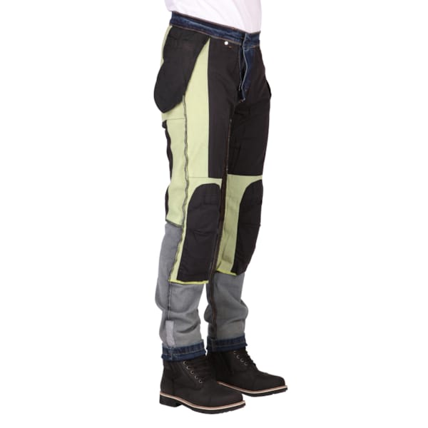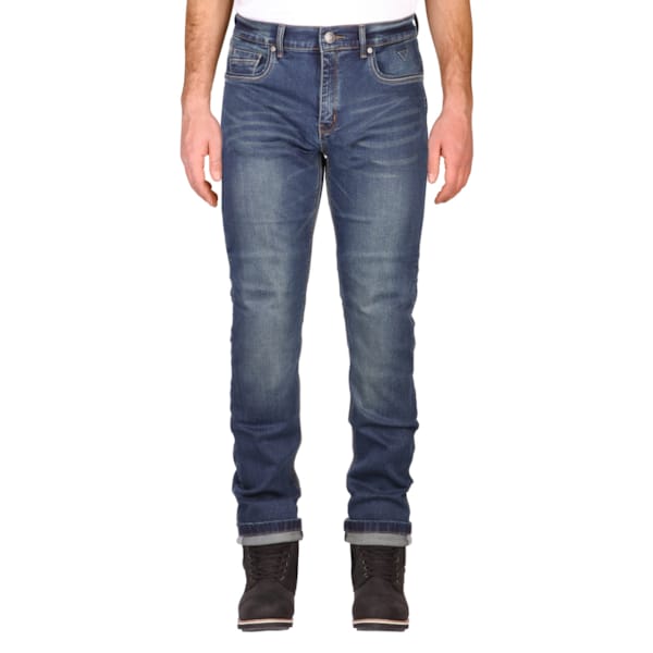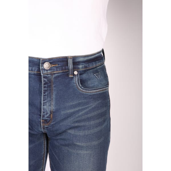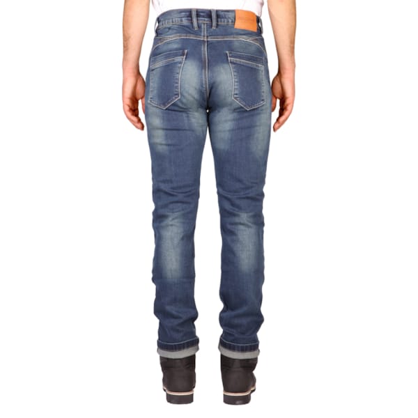 Ce pantalon est un pantalon d’été, ni plus ni moins. L’extérieur (‘aged-denim et finition stone wash) n’est pas étanche. Le jeans Glenn Slim porte l’appellation de ‘skinny fit’ : donc, ajusté. La matière stretch dont il est pourvu offre un certain confort sur la route ou en position assise sur la moto.