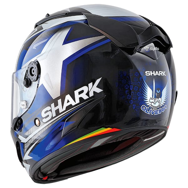 Evidemment, Jorge Lorenzo n’associe pas son nom à n’importe quoi. On parle bien d’aérodynamisme. Là où cela s’avérait nécessaire ou souhaitable, le casque a été pourvu de déflecteurs et d’un spoiler dédoublé, selon la stabilité et la pression plus ou moins constante sur le corps du motard. Une meilleure stabilité est directement liée à une meilleure visibilité – non négligeable sur circuit. D’où la visière (optique de classe 1) à densité variable et quatre points d’ancrage, option de sécurité brevetée. Outre, la visière transparente de série préparée pour tear-offs**, des visières teintées, une visière transparente préparée Pinlock, un film Pinlock et des tear-offs sont également disponibles pour le RACE-R Pro. Il est évident qu’elle a subi un traitement anti-rayures et anti-condensation tout comme elle est pourvue du système ‘quick release’.