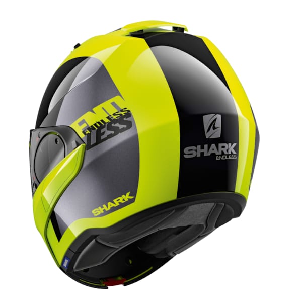 Compact, léger et extrêmement polyvalent, ce casque bénéficie d’une double homologation, en tant que casque intégral mais aussi comme casque Jet, atout non négligeable. Les casques Evo ont déjà fait leurs maladies de jeunesse. L’Evo ES de Shark pèse 1650 grammes ; il est fait, comme ses frères, de thermoplastique induit par injection. Les tailles de casque se répartissent en deux coques de casque pour conserver compacité et légèreté.
