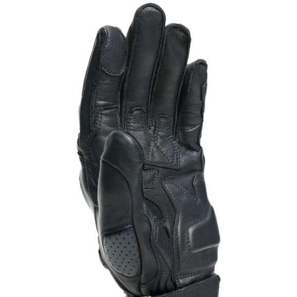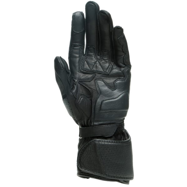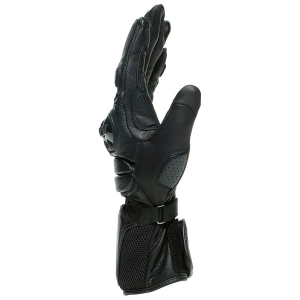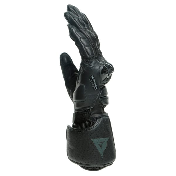 Le gant Impeto, mi-long, est un gant de moto relativement fin, exempt de membrane ou de doublure. Du matériel de course dans le plus pur esprit. Vous ressentez ce qui est et c’est ainsi que cela doit être. La manchette remonte presque au poignet et peut être ajustée au moyen d’une large bande Velcro. Une autre bande Velcro, plus étroite, située sous l’éminence permet de maintenir le tout bien en place.