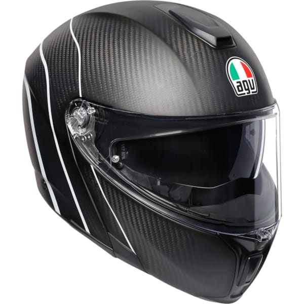 Si le mot ‘intégral’ rencontre le mot ‘système’, c’est, sans doute, ce qu’AGV avait dans la tête quand il a lancé le Sportmodular. Ce casque modulable (homologué tel quel) est constitué à 100% de fibres de carbone.