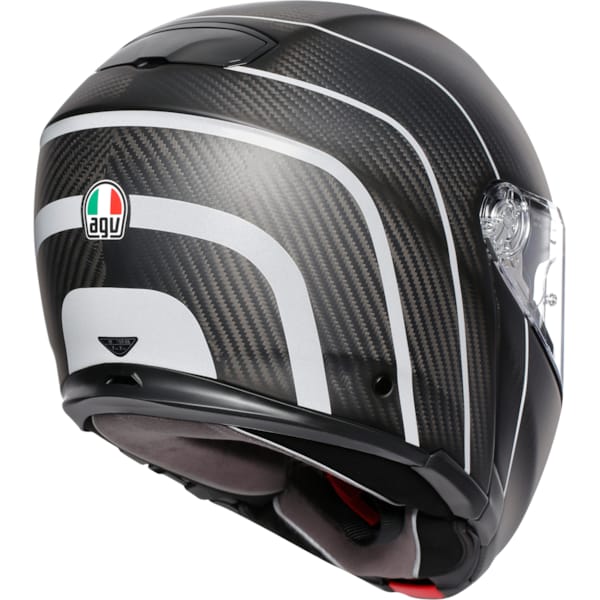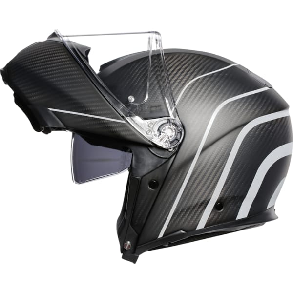 La coque de casque du Sportmodular a subi des tests dans un tunnel à vent afin de lui procurer un maximum de stabilité, d’aérodynamisme et de silence. Résultat : une forme de coque de casque très épurée. En outre, cette même coque de casque -faite à 100% de fibre de carbone- existe en trois formats pour contenir toutes les tailles de casques. En découle un poids incroyable -à prendre ou à laisser- de 1250 grammes. Pour un casque modulaire avec visière solaire intégrée.
