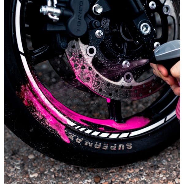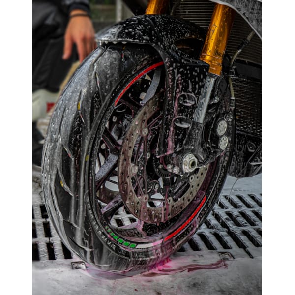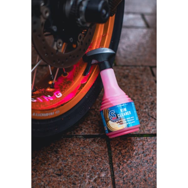 Heureusement, en matière de nettoyant pour jantes, ’l’odeur de pin frais’ n’est pas un critère : ce S100 a pour objectif de nettoyer et -croyez-nous encore une fois- il le fait. Bien. Qu’il s’agisse de graisse, d’huile, de lubrifiant ou d’insectes, incrustés, séchés ou collés, tout s’en va. La dernière fois que vous avez vu un pont arrière, une jante ou un bloc moteur aussi propre, c’était sans aucun doute dans la salle d’exposition de votre concessionnaire moto.