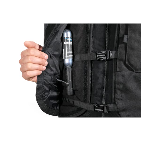 L’airbag Helite se gonfle en une fraction (un dixième) de seconde et, en cas de chute, protège le dos, le cou, le torse, les côtes et les clavicules. La protection de cou agit comme une minerve et stabilise le cou et le casque lors d’une chute. Une protection dorsale SAS-TEC (niveau 2) y est intégrée d’origine.
