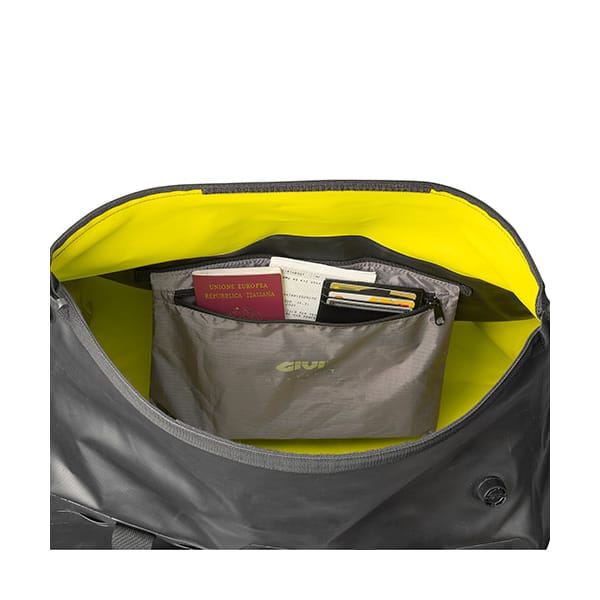 Pour ceux qui se posent la question : la prise d’air intégrée sert à réduire la taille d’un sac cargo rempli à moitié. Plus sûr et plus pratique. La capacité de 40 litres de ce grand Canyon permet d’y ranger pas mal de choses. Bien que l’on parte du principe que cet espace de rangement cylindrique ne possède pas de sous-compartiments, GIVI a prévu un petit compartiment (limité) à l’intérieur. Rien de transcendant, juste de quoi y glisser des tickets, des papiers ou de petites choses pratiques que l’on aime séparer du reste. Muni d’une tirette, soit dit en passant.