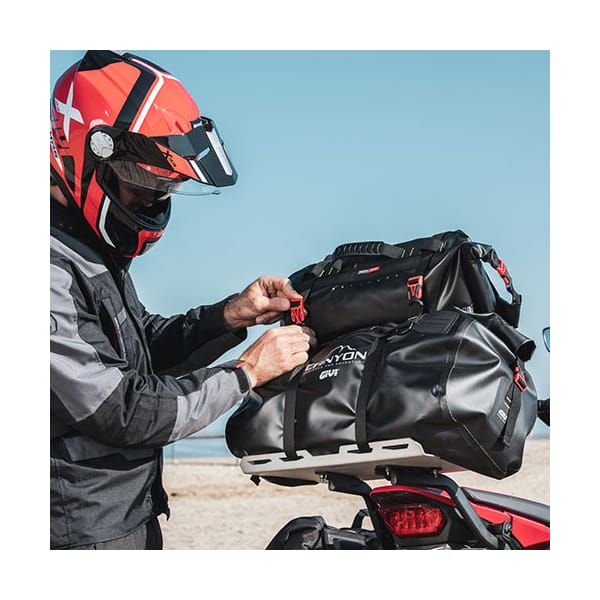 La nouvelle collection Canyon, revisitée, de GIVI met clairement l’accent sur le tout-terrain et l’enduro, bien que nul ne sera surpris de voir ce sac rouleau étanche sur n’importe quelle moto. Ce sac cargo robuste trouve sa place tant sur la selle du passager que sur le porte-bagages ou sur un support de valise. Le principe est le même, toujours et partout : un espace de rangement étanche de forme cylindrique avec fermeture rouleau, flexible et adaptable. Et merveilleusement pratique à moto.