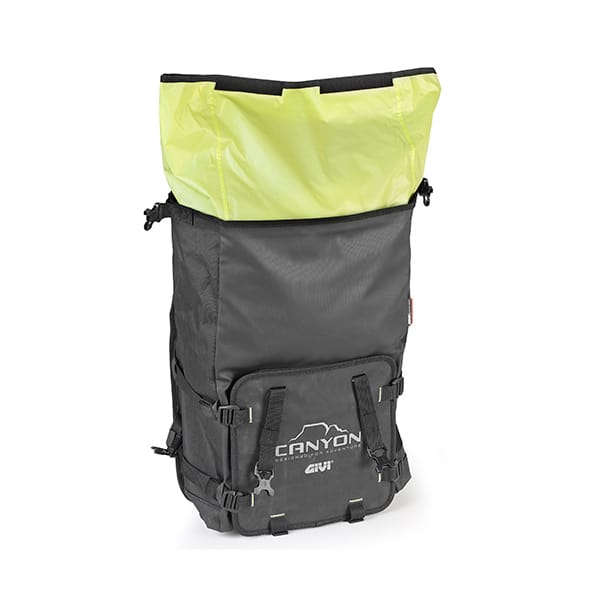 Ces sacoches latérales flexibles sont étanches à l’eau et faites de polyester 1200D. Avec une couche de 1680D, une couche de PU, résistantes aux UV et une finition Hypalon. En langage clair : elles peuvent rouler sur le sol à plusieurs reprises et faire le tour du monde avant de prendre -éventuellement, peut-être – un peu de repos. Une chose est sûre, c’est du matériel solide. Ne vous méprenez donc pas sur leur apparence souple : ce sont de véritables aventurières. La gamme Canyon s’enorgueillit de ses caractéristiques étanches, mises en valeur par les fermetures rouleaux typiques et l’espace de rangement interne, jaune fluo, étanche.