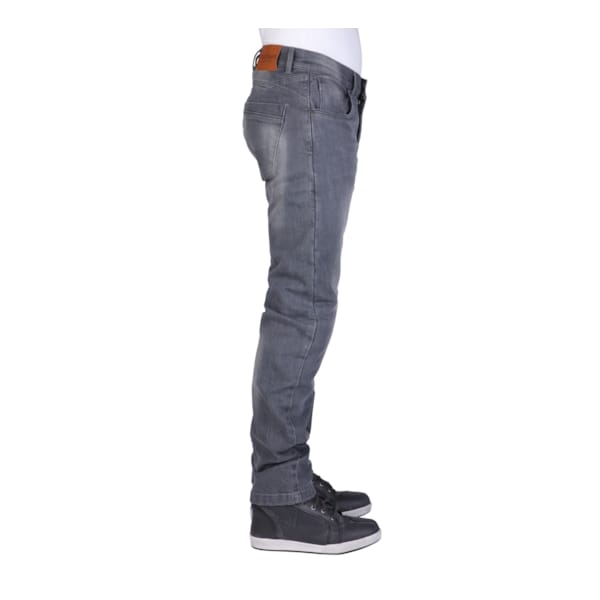 La coupe est de type ‘regular fit’, c’est-à-dire pas excessivement étroite, et, sachant que les positions à moto et à côté de la moto, sont quelque peu différentes, un peu d’espace est bienvenu. Pour ces mêmes raisons, le ‘regular fit’ – généralement tout droit – bénéficie d’une bonne courbure. Cela se remarque surtout lorsqu’il pend sur un cintre. À moto aussi, mais plutôt en raison de sa position assise, confortable. L’arrière est un peu plus haut que ce que l’on attend d’un jeans ordinaire et recouvre le bas du dos, mais c’est tout de même un jeans de moto.