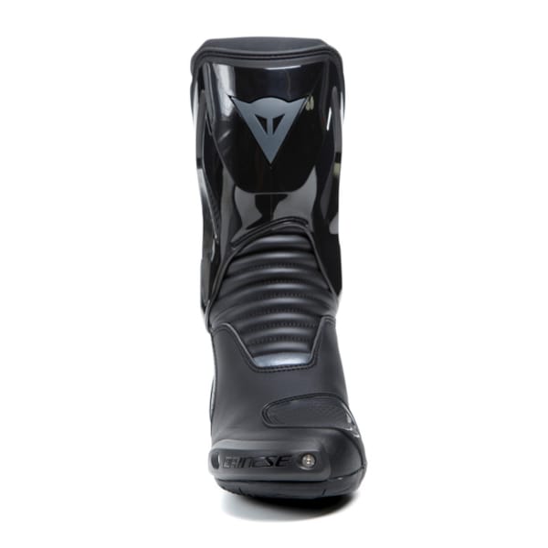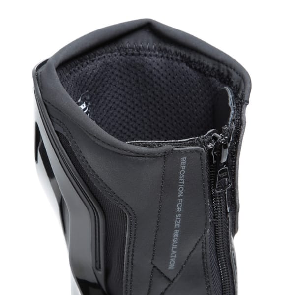 L’extérieur est toujours constitué, en majeure partie, de microfibres (pas de cuir, l’on pourrait s’y méprendre) et de matériau D-Stone® de très bonne qualité, même s’il semble difficile de passer à côté de la protection de tibia en thermoplastique-polyuréthane. Parler de tibia est un peu restrictif car, à l’instar d’un exosquelette, le polyuréthane brillant s’étend de la cheville au tibia. La charnière au niveau de la cheville inspire confiance et donne plus de confort que ce que l’on pourrait imaginer au premier abord. Sans doute aussi parce que le talon est emballé dans le même matériau, DAINESE a créé l’effet de protection externe que l’on attend d’une botte de moto.