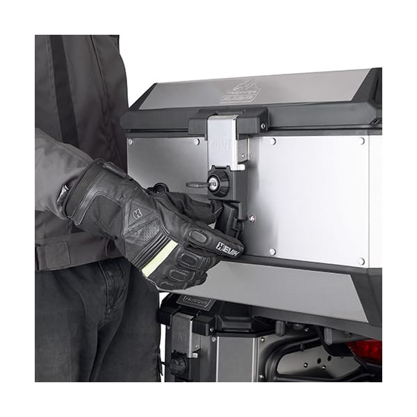 Pour fixer le top case, il suffit d’encliqueter sur la plaque du top case. Sur tous les supports de top case Monokey®, à l’exception de ceux avec kits de feux de circulation et connexion. Aucune action supplémentaire n’est requise : ‘encliqueter’ est l’état naturel d’un top case. Pour le détacher du support de top case, il suffit de tourner le bouton externe sous le cadenas. Vous libérez l’ALA56 via un système de câble (breveté WIRELEASE® SYSTEM).
