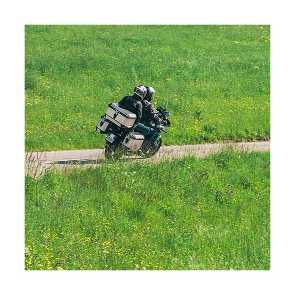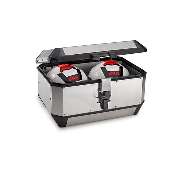 Les valises latérales Alaska de GIVI existaient déjà et voilà que s’ajoute à présent cet impressionnant top case Alaska (ALA56). Son grand format et son apparence en aluminium en font un polyvalent. Deux casques s’y intègrent sans problème et, en termes de rapport qualité/prix, il n’y a pas à discuter.