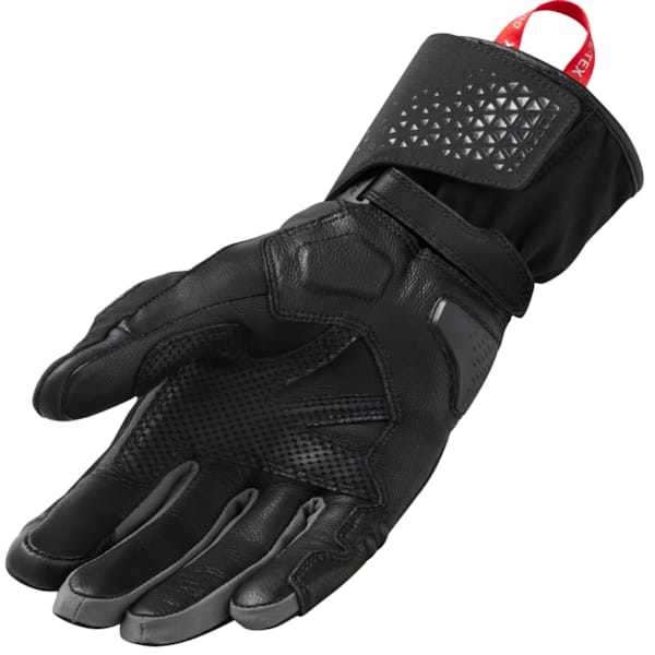 Evidemment, les propriétés imperméables ne sont pas la seul chose importante pour des gants moto. Le Contrast GTX est doté de beaucoup de cuir de chèvre d’un côté. Le cuir de mouton de Pittards Planett (sous forme de « grip patches ») sur la paume et le pouce devrait fournir une adhérence supplémentaire, tandis que la manchette et le dos de la main sont suffisamment extensible pour que tout reste confortable et mobile. Et une fois de plus : ce résumé fait s’attendre à un gant moto épais, mais ce n’est pas du tout le cas. Le Contrast GTX a une longue manchette que vous pouvez resserrer avec du Velcro pour le porter en dessus ou en dessous de la manche. Une bande Velcro transversale maintient tout en place.
