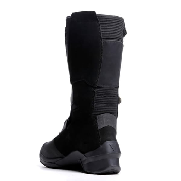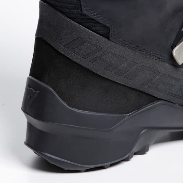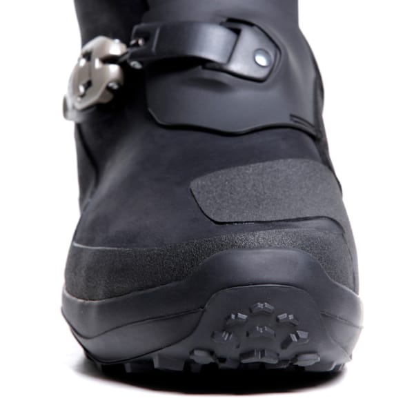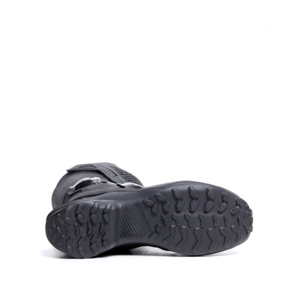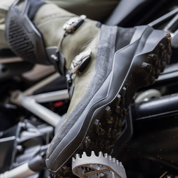 C'est en effet du cuir bovin pleine fleur qui constitue le composant principal de cette botte moto de DAINESE. Avec un peu d'aide (invisible) de la membrane Gore-Tex® Performance intégrée, et quelques éléments en plastique assurant la protection, le résultat est une botte moto solide. La tige atteint 35 centimètres au-dessus du sol. Les tiges sont dotées d'un système de laçage de l'avant vers l'arrière qui se cache derrière le double fermoir et le protège-tibia. D'accord, on ne glisse pas dedans comme si ce n'était rien, mais enfiler et enlever la Seeker ne prend pas non plus une demi-journée. Et bon : elle reste toujours une botte moto solide, ce n'est pas une pantoufle.