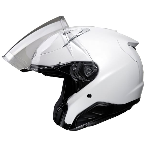 Le RPHA-31 est livré, de série, avec une visière transparente qui mérite un mot d’explication. On remarquera aussi les deux ‘fermetures’ situées dans la partie inférieure, qui maintiennent la visière du casque repliée en place, ce qui est utile si vous conduisez sur l’autoroute et que vous relevez la tête un instant. C’est bien possible. Faites particulièrement attention au centimètre supplémentaire de longueur de visière que vous pouvez littéralement ‘tirer’ de la partie transparente. Nous ne l’avions pas vu ailleurs nous-mêmes, mais c’est certainement quelque chose d’intéressant – surtout pour un casque jet.