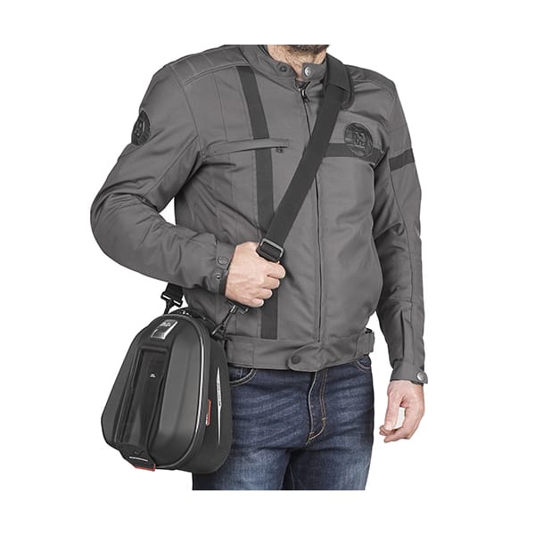 La ST611 de GIVI est faite de panneaux préformés durs, recouverts de EVA 900DD. Pour en faire un ensemble solide et stable. Ne comptez donc pas sur une certaine flexibilité. Elle est livrée avec une housse de protection. La présence d’une poignée et d’une bandoulière amovible permet d’emporter la sacoche de réservoir sans problème lors d’une étape. Les détails réfléchissants améliorent sa visibilité le soir et la nuit.