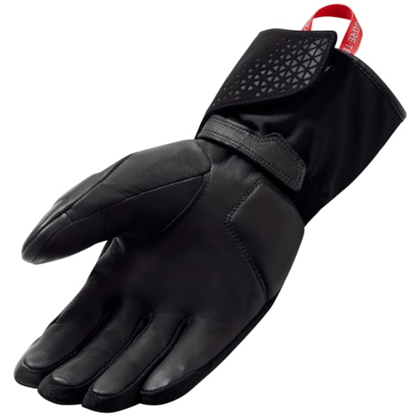 Sa coque extérieure consiste – comme c’est souvent le cas, et surtout chez REV’IT! – en un mélange sophistiqué. Du cuir de chèvre, tant sur la manchette que sur la paume de la main. Enduit en une couche épaisse pour lui donner du corps et pour inspirer confiance. Le reste de la manchette est fait de PWR | SHELL : résistant et idéal pour y incorporer sa grande fermeture velcro.