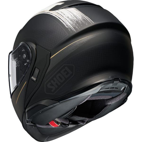 Les coussinets de joue d’une nouvelle génération enveloppent encore mieux le tour de la nuque, et s’adaptent mieux au visage et à la tête aussi. De toute évidence, l’objectif de cet intérieur – amovible, lavable et personnalisable – est double : s’adapter à la perfection et éliminer le bruit. Les casque modulables, dans le temps, étaient parfois exposés à tous les vents, mais le Neotec 3 fait un nouveau pas dans la bonne direction. Une bavette anti-remous, un tour de cou spacieux, et le bien nommé « noise isolator » dans les coussinets de joue en font un casque silencieux. La douce jugulaire réglable nouvelle – ‘Micro Ratchet’ – est une fermeture à cliquet-en acier-inoxydable développée et brevetée par Shoei, qui reste surtout facile et rapide à utiliser.