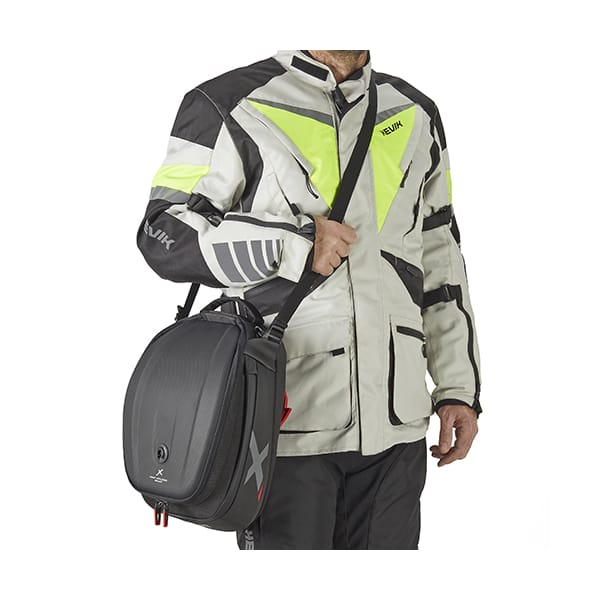 La gamme X-Line de GIVI se caractérise par une coque 1200D, solide et robuste, et des empiècements de TPU. Partiellement préformée, résistante aux UV, REACH, voilà une solution de bagages à ne pas négliger. Cependant, GIVI préconise ici l’idée de ‘keep it simple’ car, outre un compartiment central et un sac intérieur étanche, elle ne semble pas, au premier abord, comporter grand-chose. Rien n’est moins vrai : vous disposez d’une poche supplémentaire à l’avant – séparée et accessible au moyen d’une tirette – et d’un support de carte transparent à fixer sur le XL06. Soit dit en passant, ceci se fait étonnamment bien. Grâce à un aimant Fidlock®.