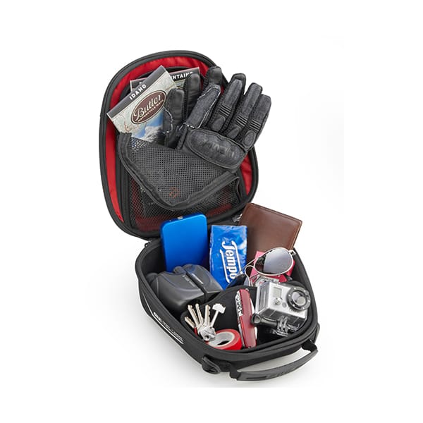 Attention ! Les sacoches tanklock se fixent au bouchon de réservoir qui -normalement- se trouve à un endroit standard. C’est-à-dire : une sacoche tanklock ne glisse pas comme cela peut être le cas avec les sacoches magnétiques que vous pouvez placer selon vos souhaits, un peu plus haut ou un peu plus bas sur le réservoir. Ce qui peut parfois poser problème avec les ‘naked’ plus courtes dotées d’un réservoir relativement court, du moins si vous utilisez des sacoches de réservoir tanklock grand modèle. Quoi qu’il en soit : plus d’espace pour les valises ne peut se faire au détriment du guidon.