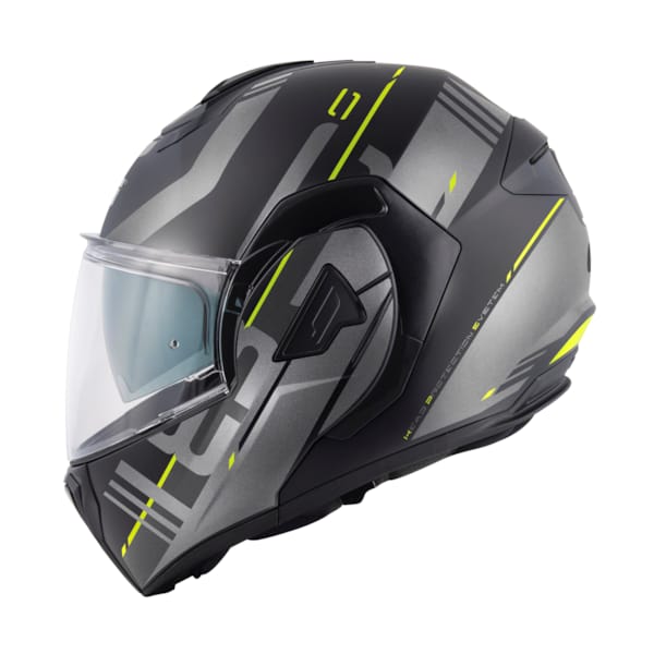 Un système de coulisse (ouverte ou fermée) permet de réguler la ventilation à partir du menton et du haut du casque. Si vous n'avez jamais pris la route avec ce type de casque de moto, la mentonnière relevable est plus large que ce à quoi vous êtes habitué. En bas, au centre, vous trouverez le mécanisme pour relever la mentonnière simple à utiliser. Pour activer le mécanisme, rien de plus simple ; un bouton rouge, au centre sous la mentonnière et le levier de verrouillage sur le côté gauche permettent de sécuriser la mentonnière en position remontée. Même avec des gants de moto, vous devriez y arriver sans problème.