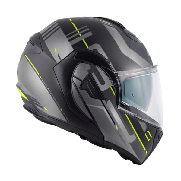 La visière transparente est préparée pour recevoir une lentille Pinlock® 70 (incluse dans la boîte), qui empêche efficacement la condensation lors de vos sorties à moto. La visière transparente s'ouvre et se ferme par la languette supérieure, et non par le bas, que l'on a habituellement tendance à saisir. L’écran solaire teinté intégré protège vos yeux des rayons du soleil. Vous trouverez la glissière correspondante en dessous à gauche.