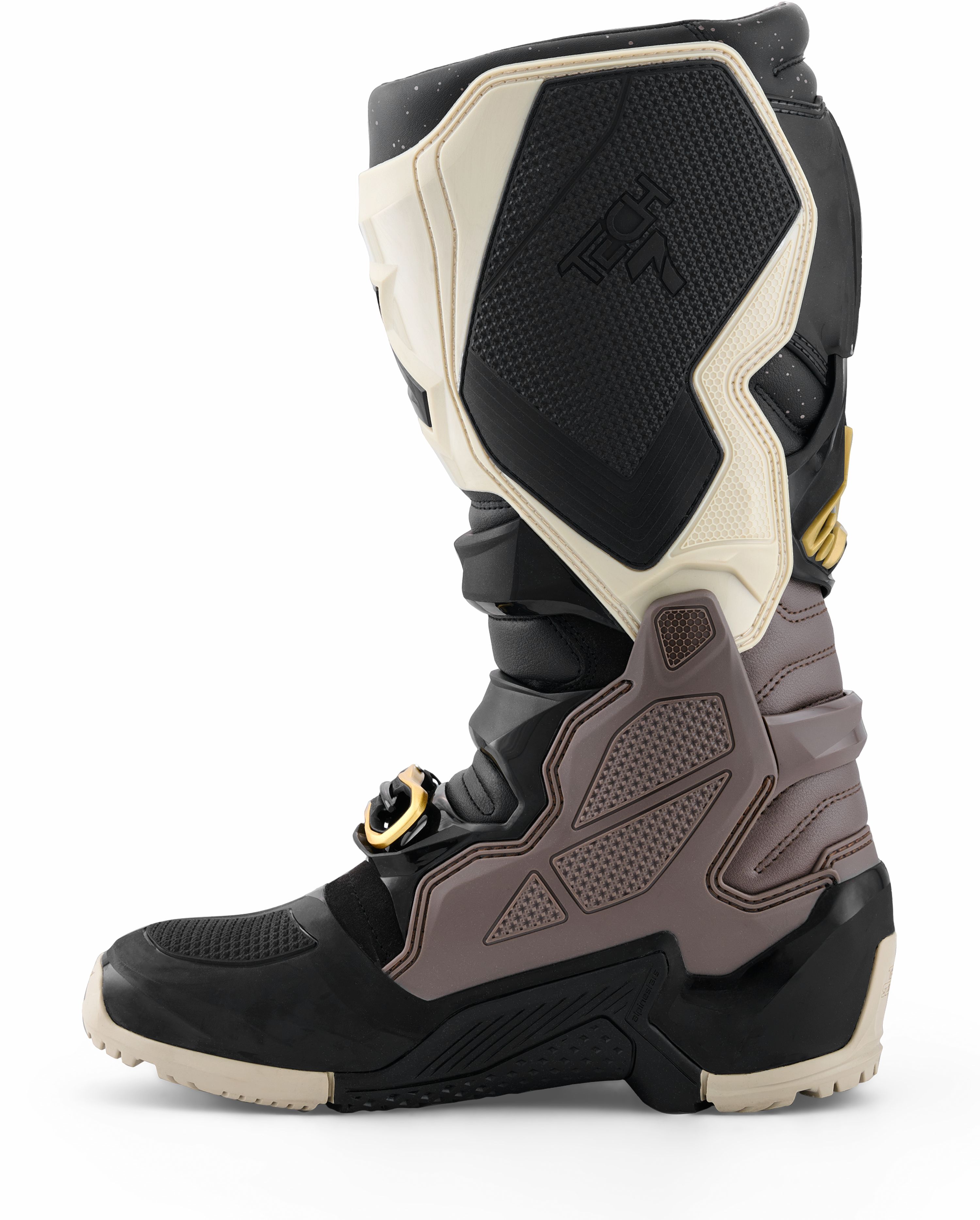 Le pilote d’enduro exigeant trouvera dans la Tech 7 la partenaire idéale et une base stable pour vivre une multitude d’aventures. Car c’est du solide : la Tech 7 est une solide compagne pourvue d’un tas de renforts en TPU à l’extérieur. Ceux-ci sont reliés les uns aux autres par le point de charnière intelligemment conçu à l’intérieur de la jambe. Pendant que vous l’admirez, jetez un coup d’œil à la texture au-dessus et juste en-dessous : l’adhérence à moto connaît de nombreuses variantes. La Tech 7 est, bien sûr, une botte de moto qui attache une grande importance à l’interaction et à la réponse de la moto.