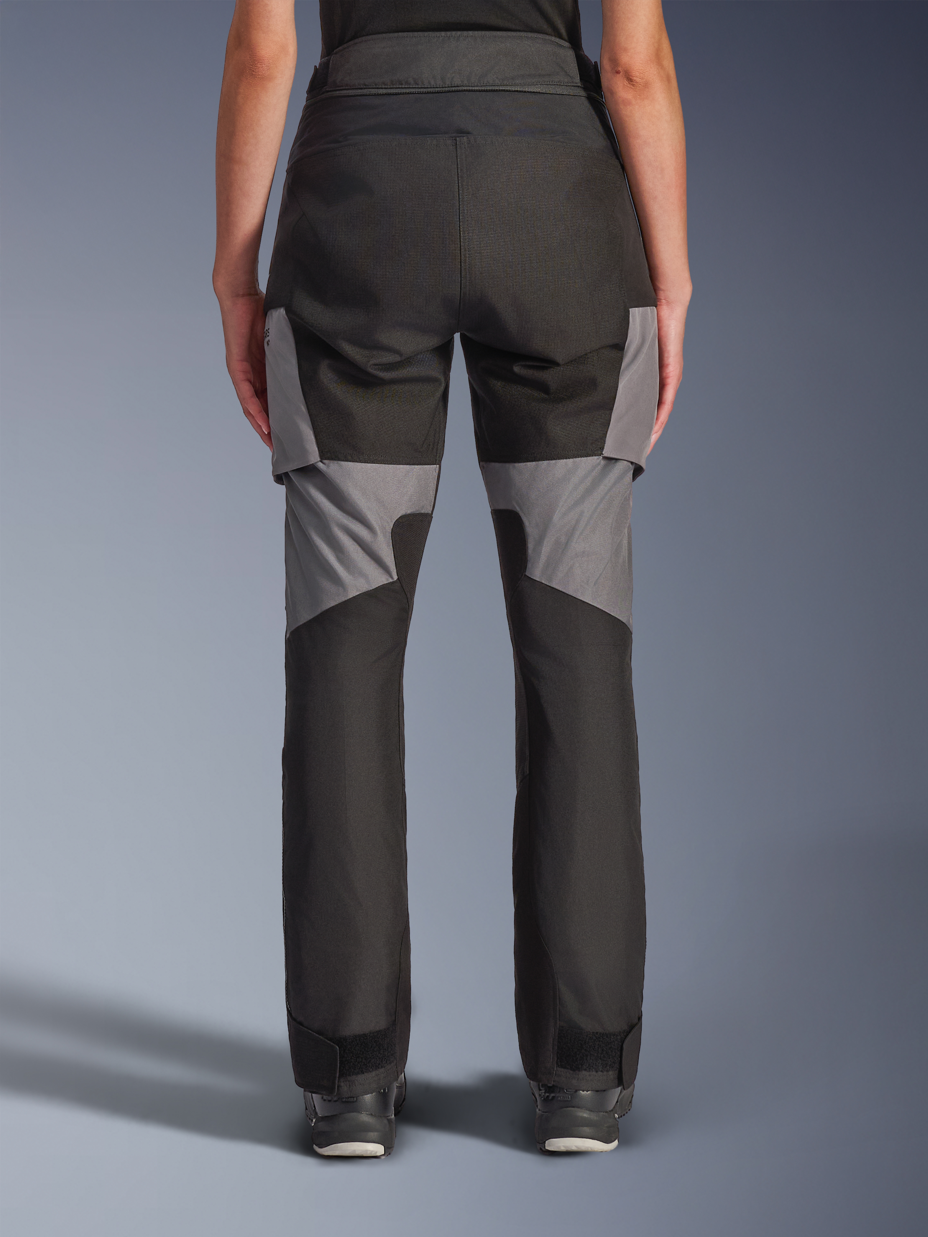Les poches cargo déperlantes assurent un rangement sécurisé. En bas des jambes, une fermeture éclair et du velcro assurent un ajustement du pantalon, tout en permettant de mettre des bottes moto.