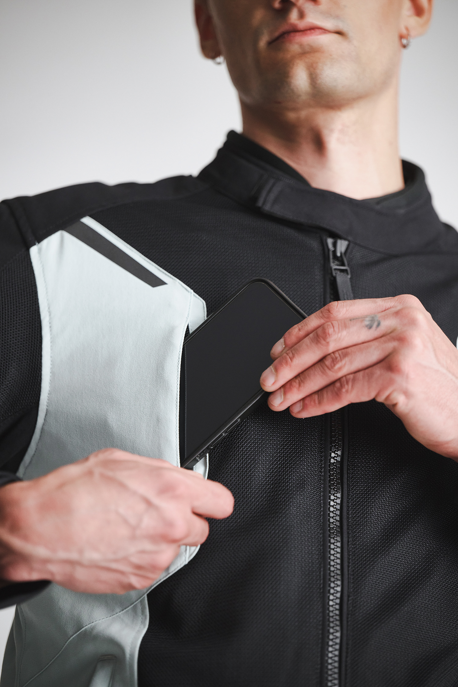Le principe du 2 en 1 fonctionne donc comme prévu : avec la membrane, vous obtenez une veste de touring imperméable, sans membrane, une veste de moto respirante pour les jours chauds. Si vous le souhaitez, vous pouvez ranger la membrane dans une poche spéciale située dans le dos, ce qui est pratique mais implique un certain encombrement supplémentaire. Cette membrane présente d'ailleurs une imperméabilité et une respirabilité que nous devrions situer dans la moyenne, si nous devions faire une comparaison. Elle souligne avant tout qu'il ne s'agit pas d'une veste de moto pour l'hiver. L'accent est mis sur les conditions météorologiques plus clémentes, avec une option permettant de faire face aux matinées fraîches et aux averses occasionnelles. Cette membrane Humax ne peut être portée que sous la veste de moto, ce qui était normal jusqu'à récemment mais qui n'est plus du tout évident aujourd'hui.