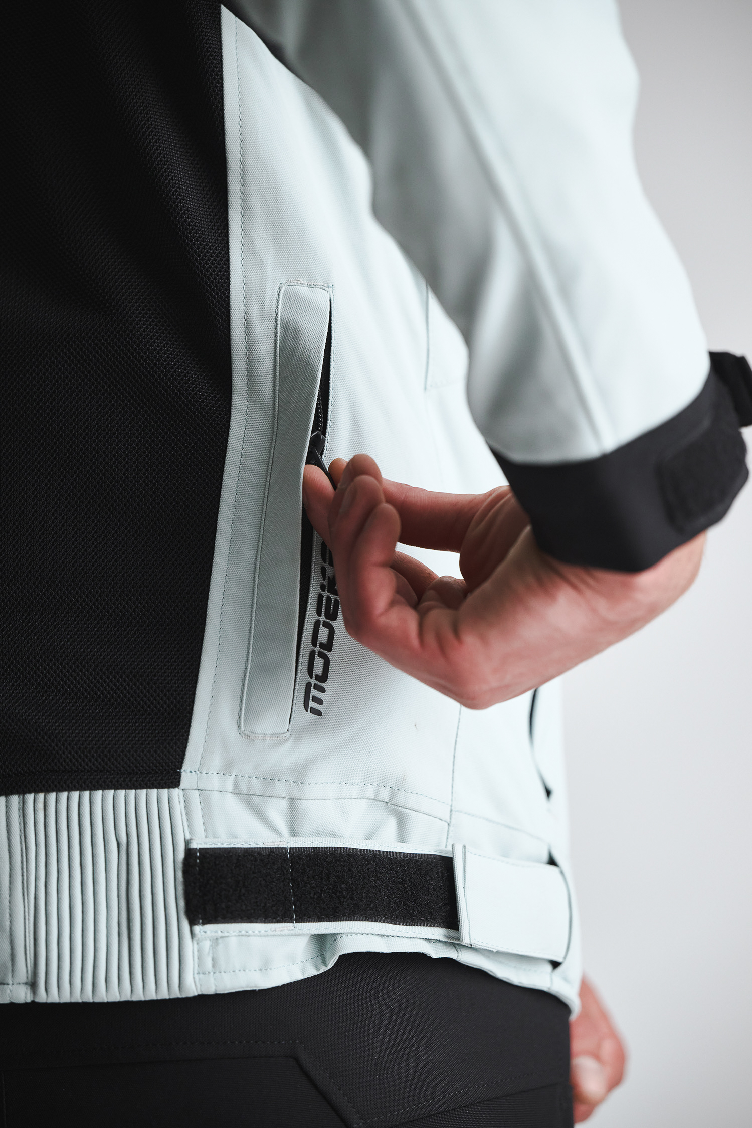 La coupe du MODEKA Khao Air II tient compte de la position typique des motards, bien que la coupe soit assez traditionnelle. Elle est courte et serrée, avec quelques possibilités d'ajustement au niveau des manches (boutons-pression), de la taille (velcro) et du col (velcro).