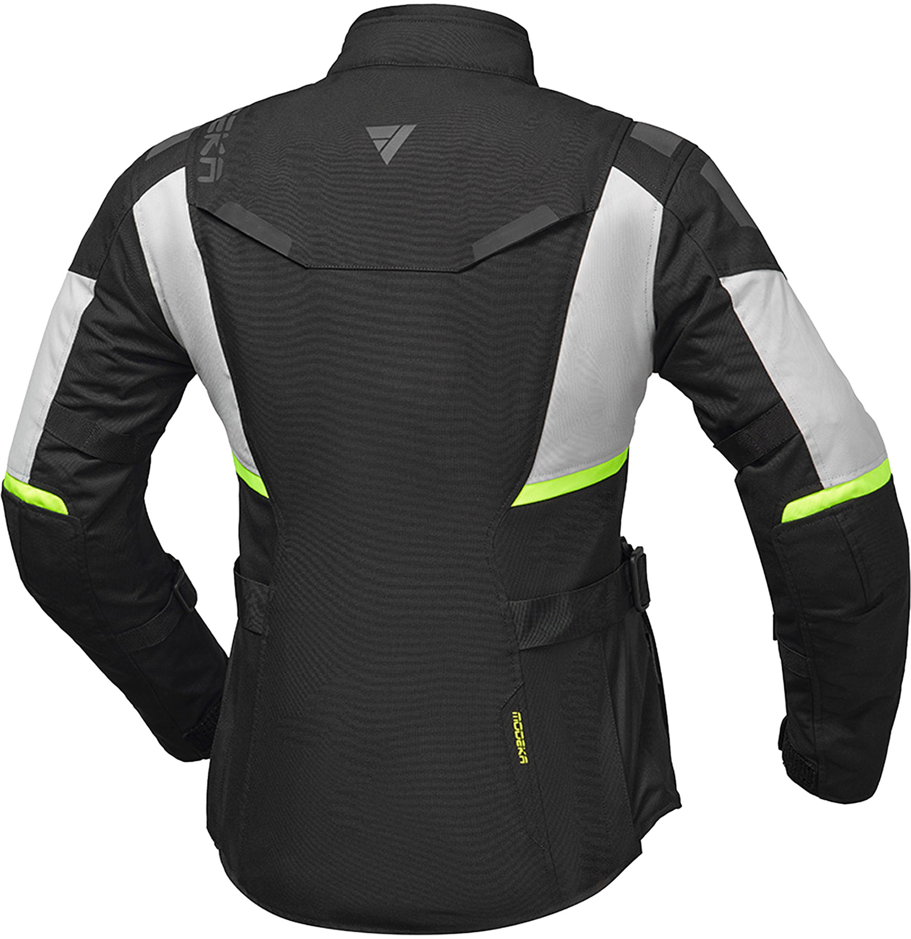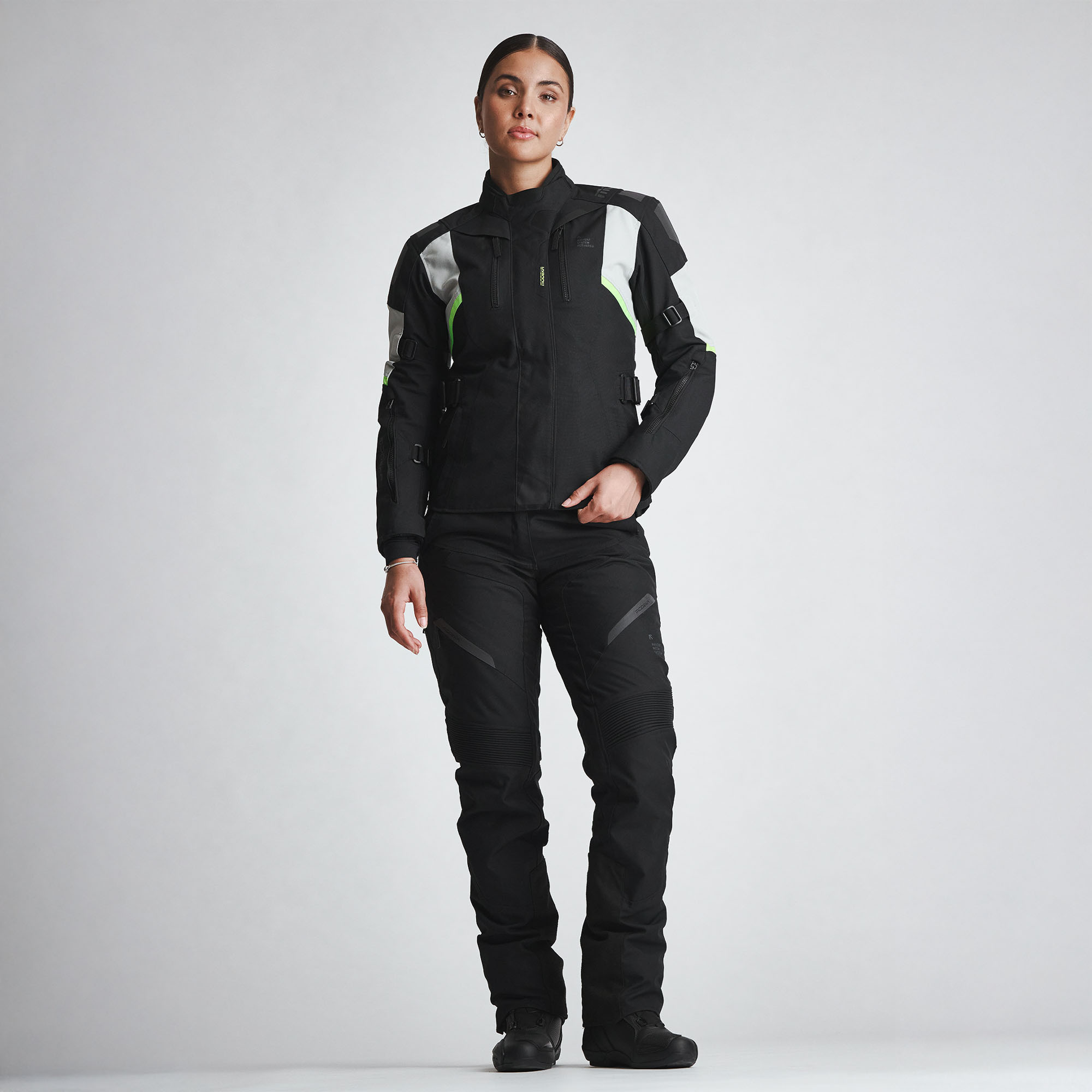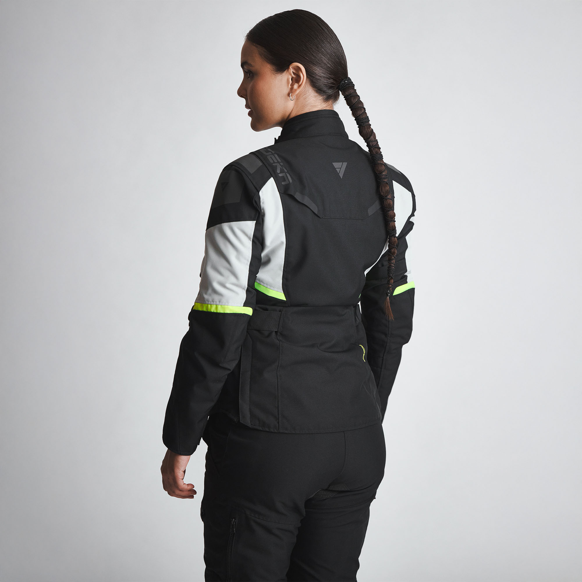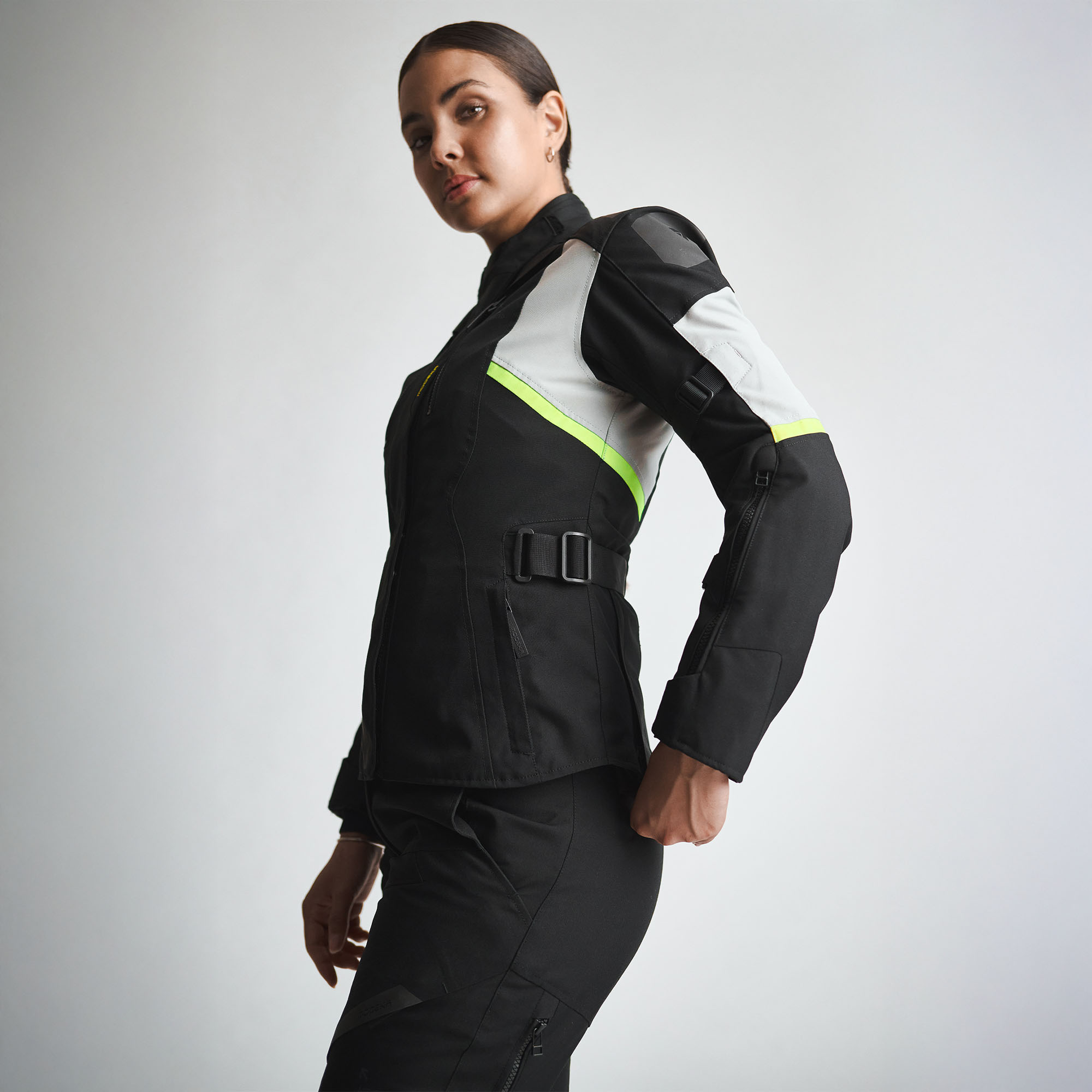 Fidèle à l’esprit touring, elle propose de multiples possibilités d’ajustement pour une coupe parfaite : sangles de centrage, deux brides sur chaque manche, mais aussi options de réglage par velcro en bas, au col et aux poignets.