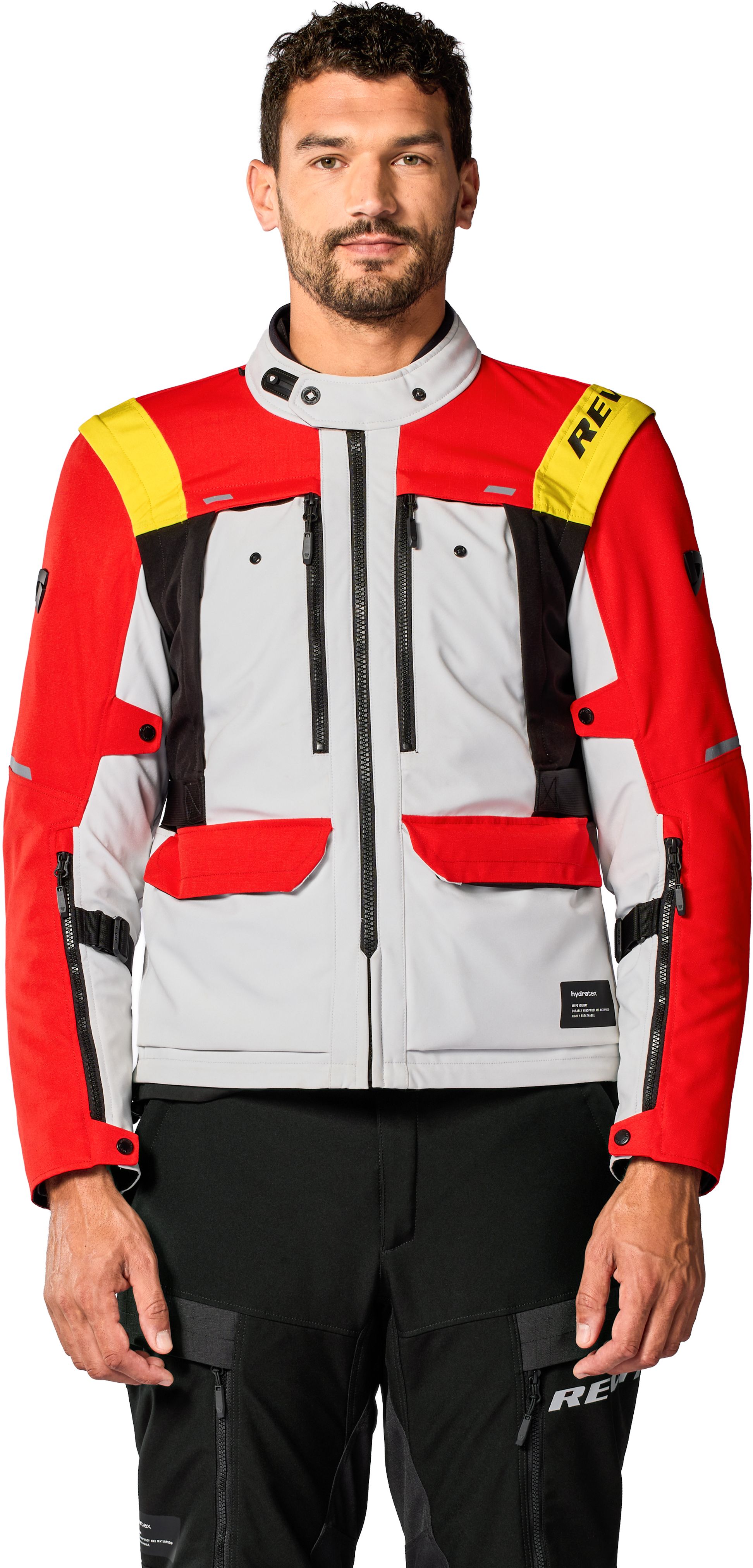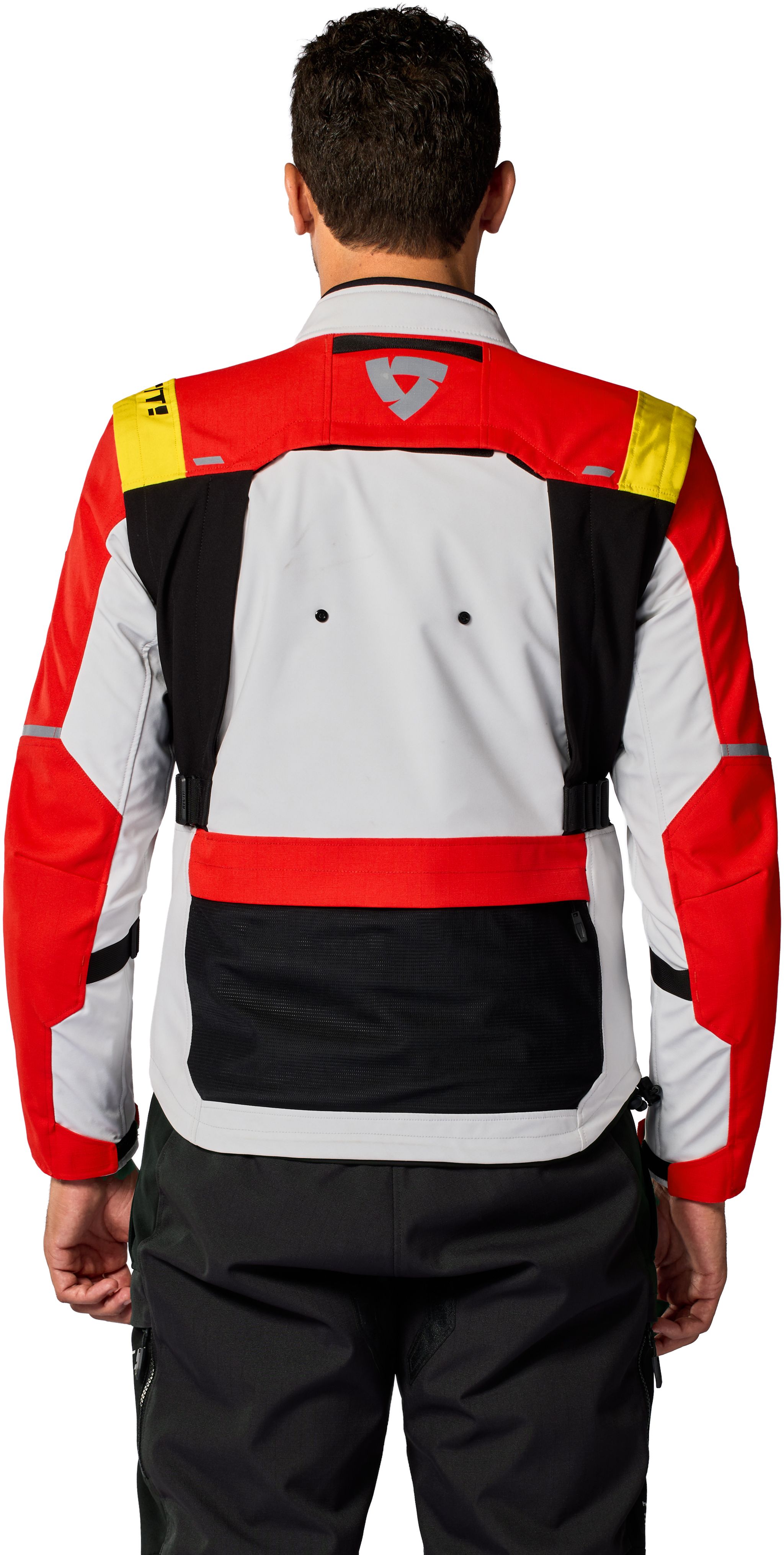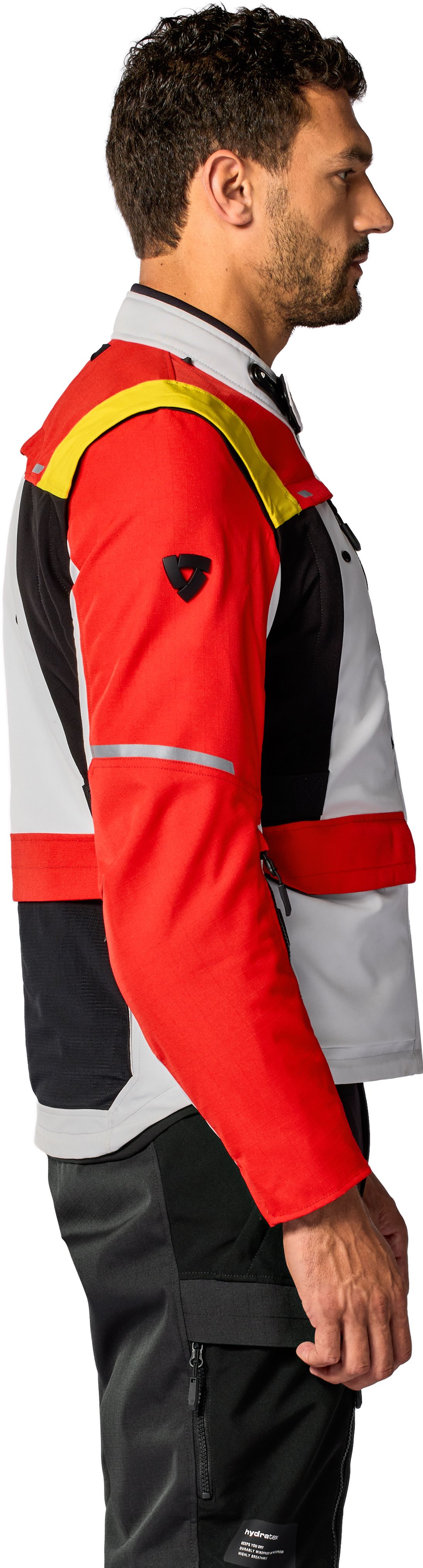 La coupe est légèrement allongée par rapport à une veste sportive, fidèle à la philosophie REV’IT! : ajustée mais confortable. De nombreux réglages sont disponibles : sangles de cintrage, boutons pression, curseurs sur les manches, col réglable Flexisnap et cordon de serrage à la taille.