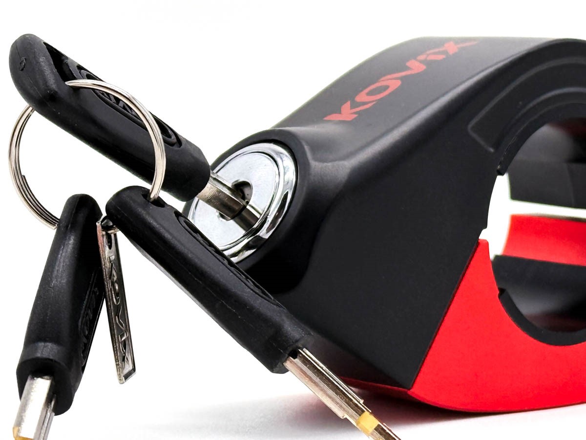 Le verrou est livré avec une petite sacoche de rangement et trois clés, ainsi qu’un code pour faire réaliser des clés supplémentaires si besoin. Les clés servent uniquement à ouvrir le dispositif de verrouillage du disque de frein. La coque et l’intérieur sont résistants à la rouille et aux intempéries, et le cylindre en acier inoxydable. KOVIX confère à ce verrou une note de sécurité de 7 sur 10.