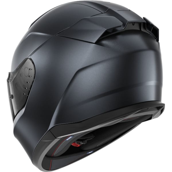 Ok, c’est tout pour la visière ? Ah ben non, il y a encore le pare-soleil intégré. Aussi doté d’un traitement anti-rayures et traité contre la buée (bien que la formation de buée soit moins probable dans un casque moto où l’air circule en permanence), il se manipule aisément même avec des gants moto, au moyen du curseur situé en haut au centre. Déplié, le pare-soleil dépasse à peine le déflecteur de vent, ce qui permet de rouler l’été avec un pare-soleil ouvert et transparent. Et avec plaisir.