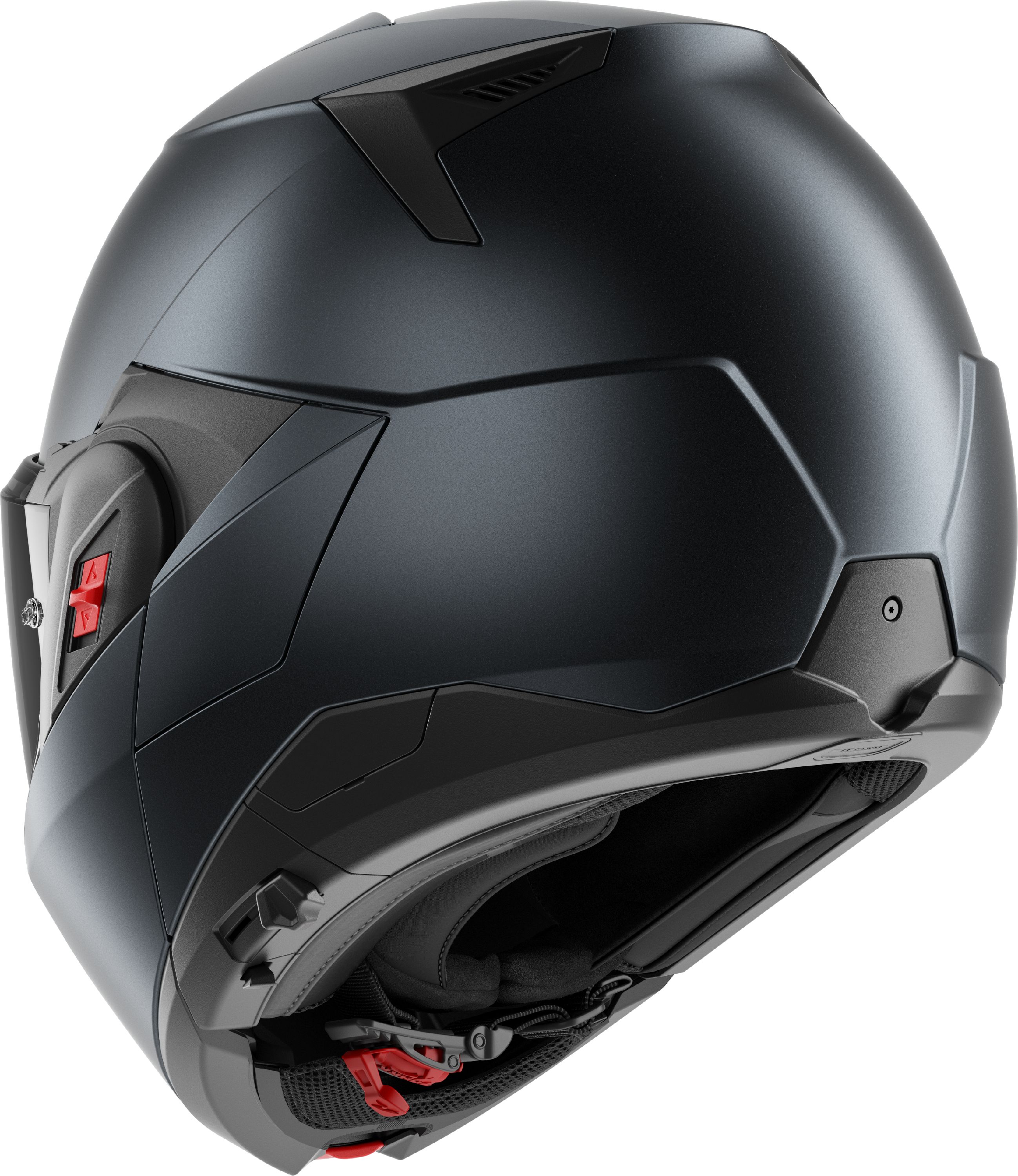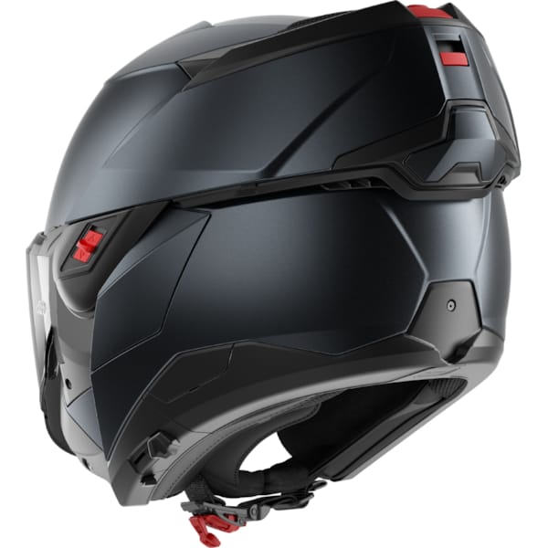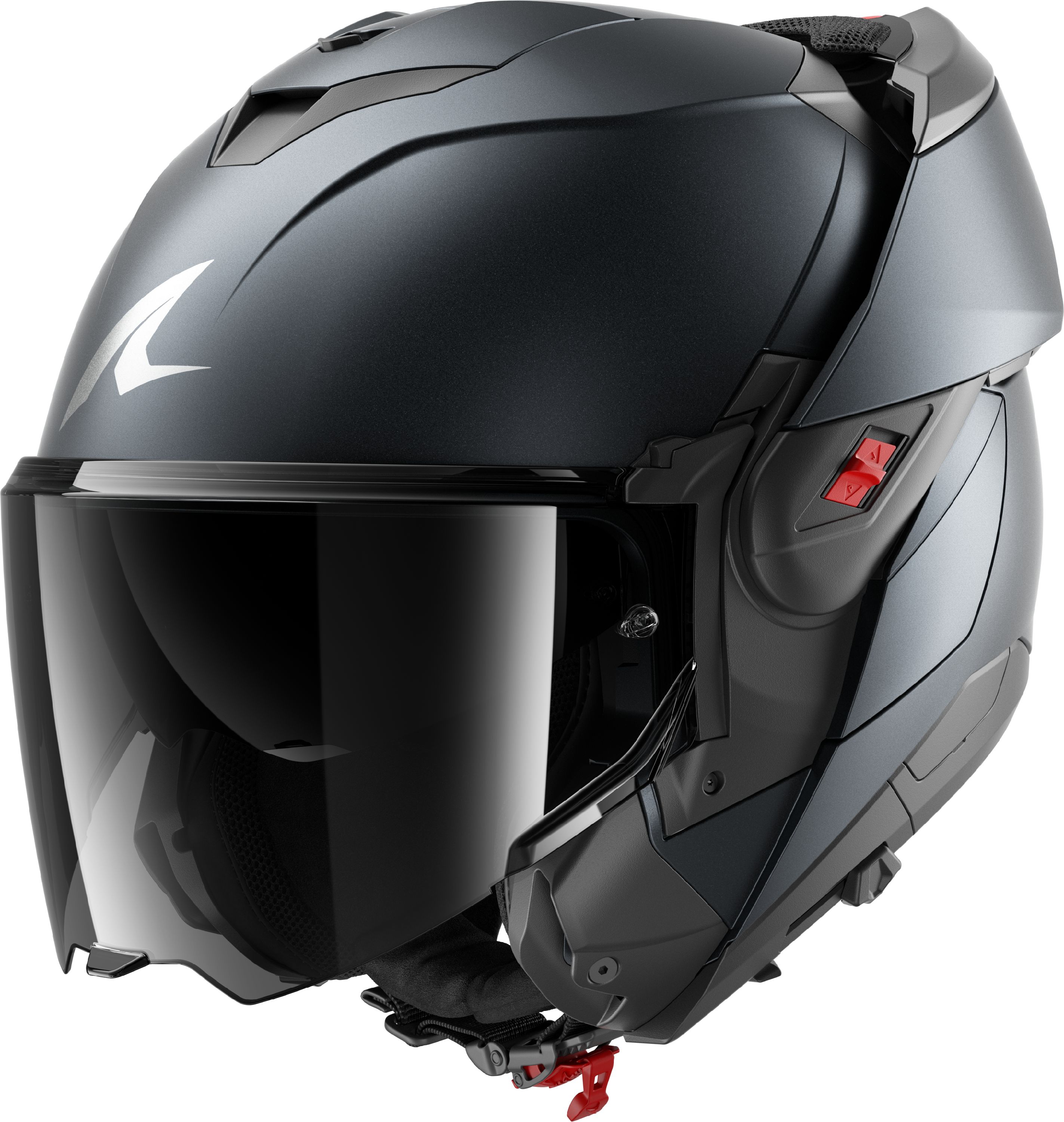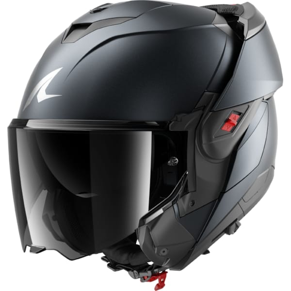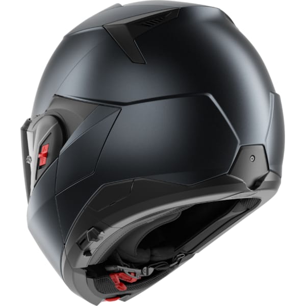 Il convient de noter que chaque nouvelle génération de casques moto à mentonnière ‘flipback’ s’améliore et ils sont de plus en plus serrés. Si les premières éditions présentaient encore une mentonnière remarquablement large (elle doit quand même entourer la coque de casque), il s’agit ici déjà d’une autre évolution évidente. Le mécanisme permettant de transformer le SHARK OXO en cours de route est situé à l’avant de la mentonnière. Les doubles boutons rouges nécessitent une double manipulation : tirer et pousser. Cela peut paraître complexe, mais c’est bien simple et cela améliore considérablement la sécurité. En position complètement ouverte, le SHARK OXO peut être verrouillé et fixé à la charnière gauche grâce à un curseur rouge.