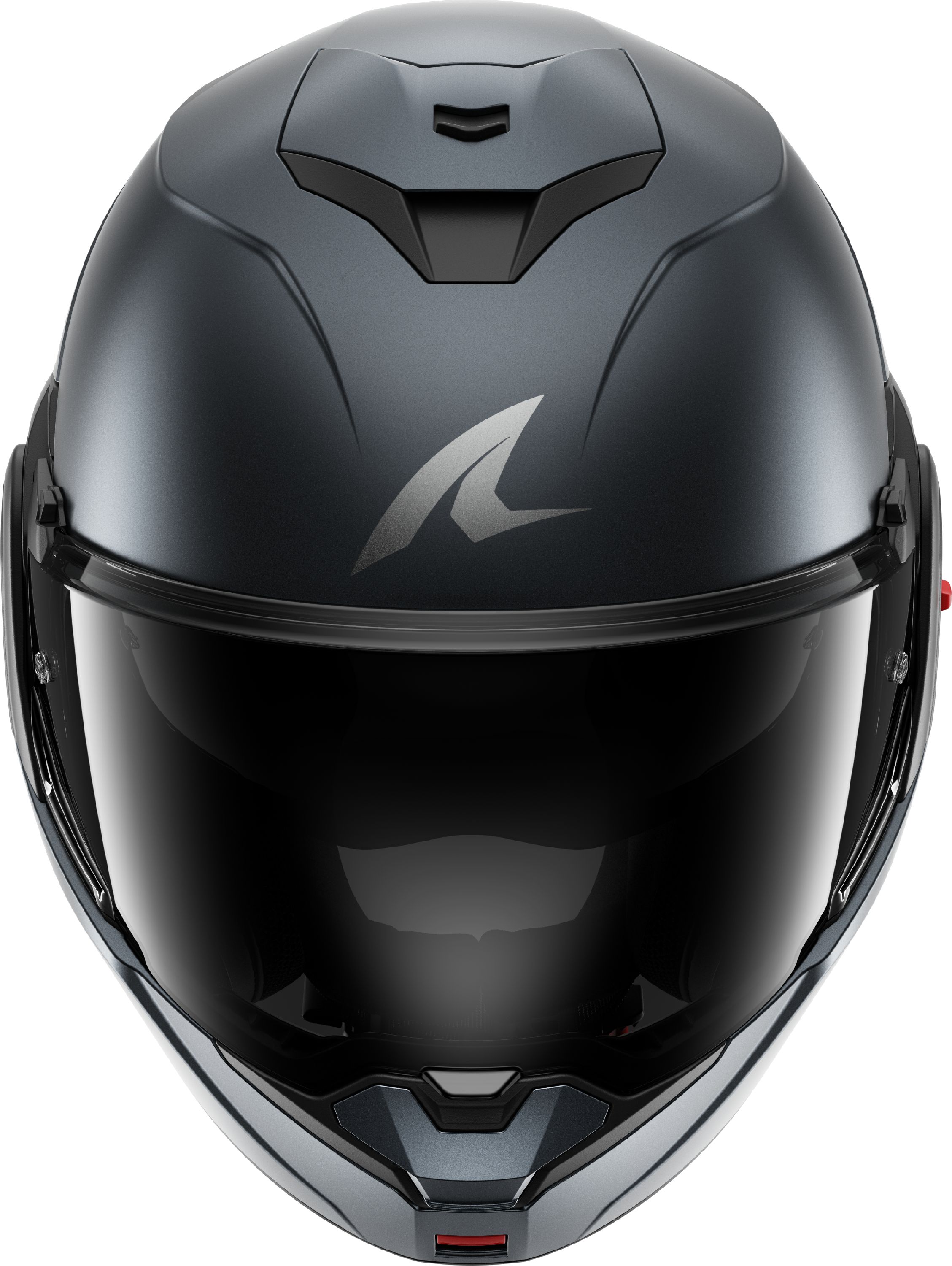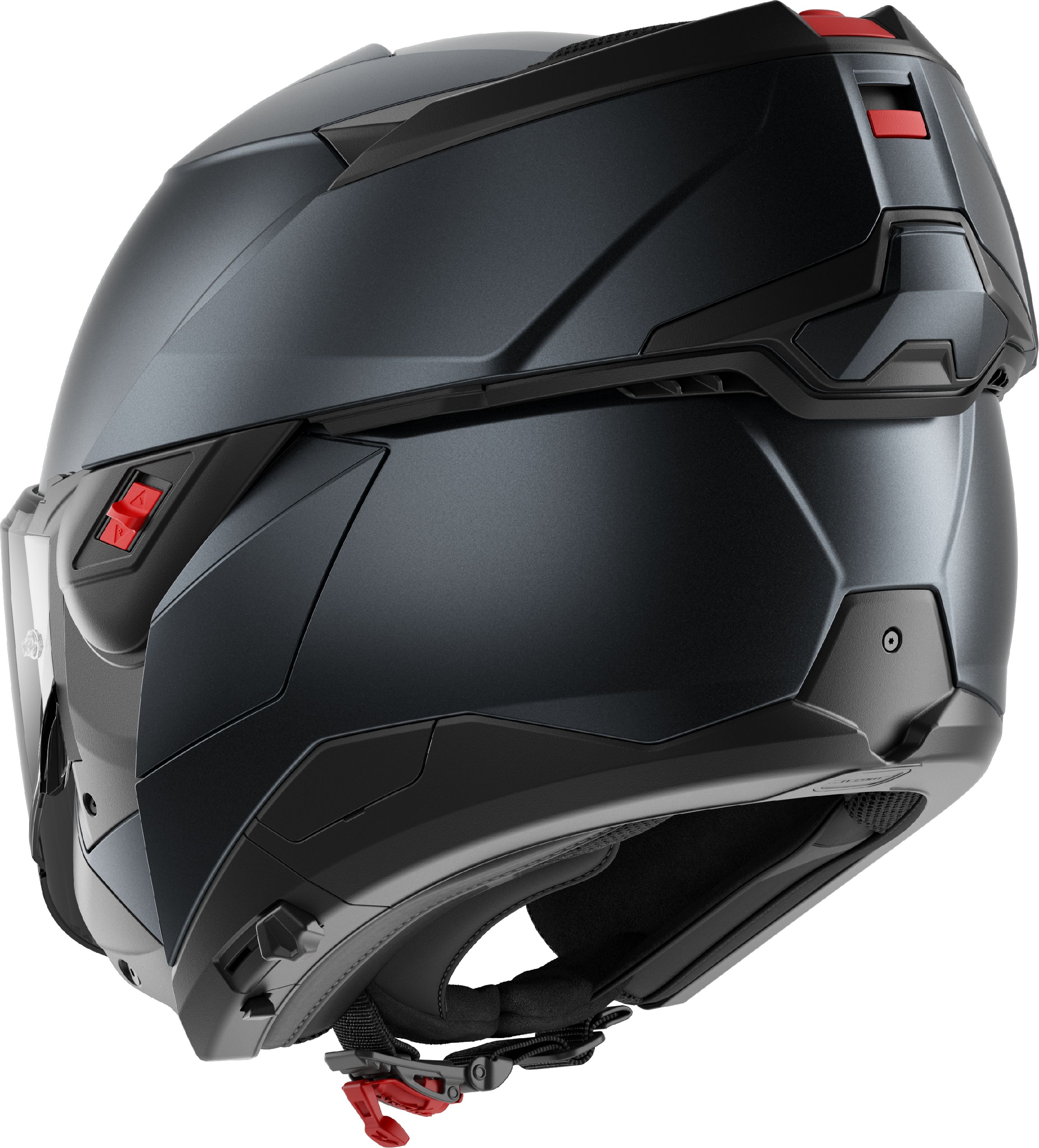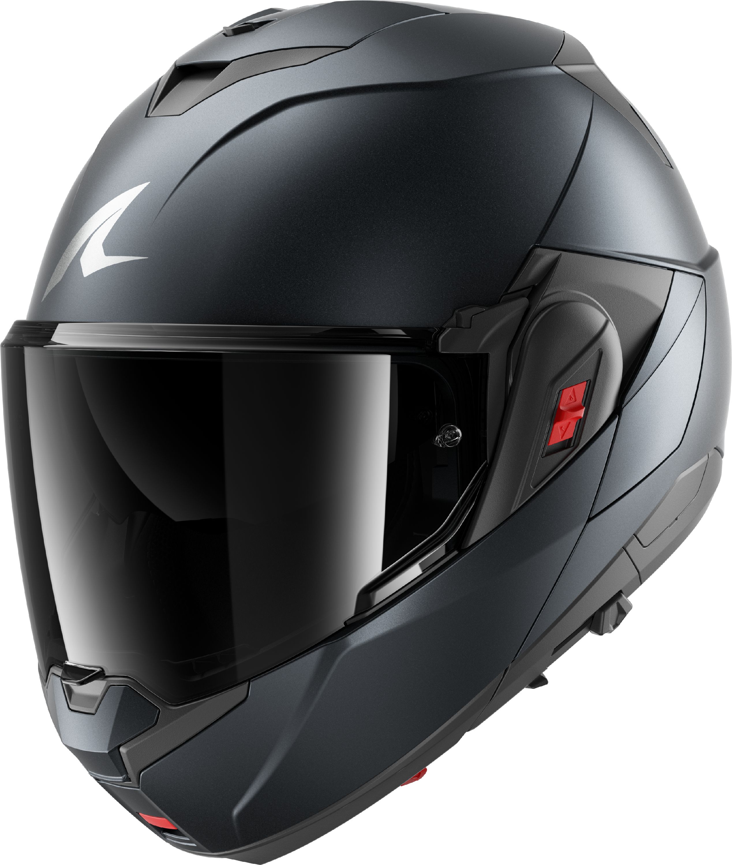Il convient de noter que chaque nouvelle génération de casques moto à mentonnière ‘flipback’ s’améliore et ils sont de plus en plus serrés. Si les premières éditions présentaient encore une mentonnière remarquablement large (elle doit quand même entourer la coque de casque), il s’agit ici déjà d’une autre évolution évidente. Le mécanisme permettant de transformer le SHARK OXO en cours de route est situé à l’avant de la mentonnière. Les doubles boutons rouges nécessitent une double manipulation : tirer et pousser. Cela peut paraître complexe, mais c’est bien simple et cela améliore considérablement la sécurité. En position complètement ouverte, le SHARK OXO peut être verrouillé et fixé à la charnière gauche grâce à un curseur rouge.