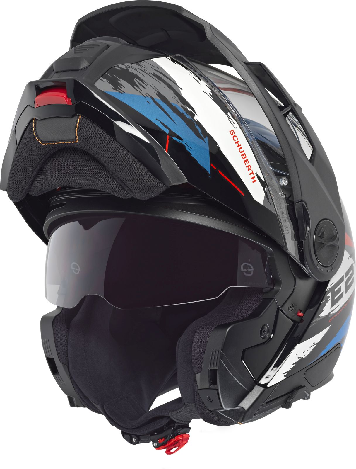 Tant en position ouverte qu’en position totalement fermée, avec l’E2, vous roulerez en toute sécurité en toutes circonstances. A cet égard, remarquons le (petit) verrou rouge à gauche, juste en dessous du point de charnière. Il permet de maintenir l’E2 en position ouverte. L’attention portée aux détails par Schubert est illustrée par la piqûre réfléchissante sur la protection au vent du menton, visible en position fermée. Magnifique.