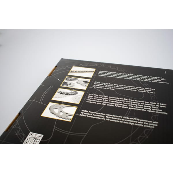 Een AFAM kettingset is een complete kit bestaande uit; een hoogwaardige ketting inclusief sluitschakel, een tandwiel vóór en een tandwiel achter. De ketting wordt exact op lengte aangeleverd.