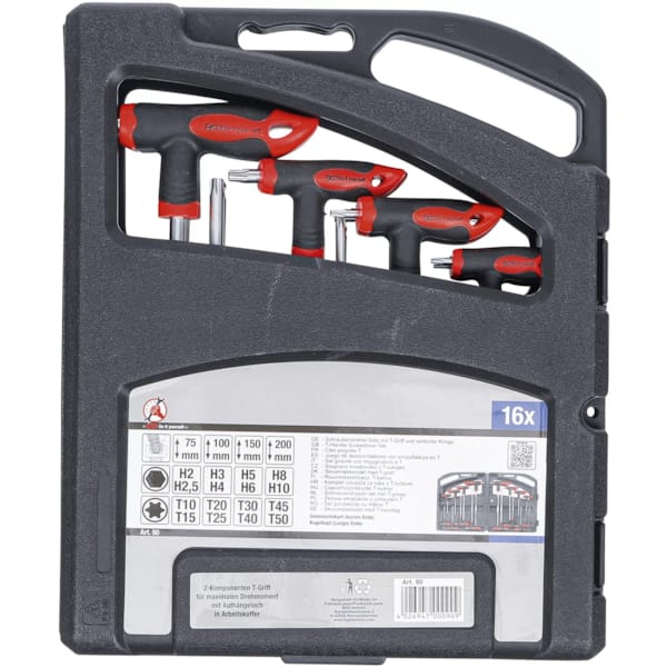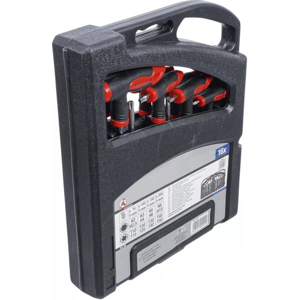 Deze 16-delige T-sleutelset bevat acht inbussleutelmaten en acht Torx-sleutelmaten. De handvaten – vervaardigd uit twee componenten – bieden goede grip voor een maximaal of net heel genuanceerd aandraaien van de bouten en schroeven.