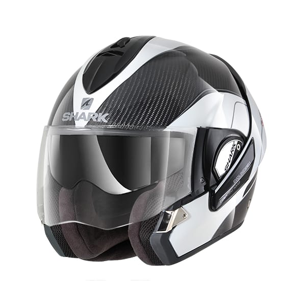 De huidige Evoline Pro Carbon is in vergelijking met de vorige versies lichter, stiller en aerodynamisch verbeterd. De buitenschaal is gemaakt van onder hoge druk geïnjecteerde thermo-kunststof wat resulteert in een supersterke maar lichte schokabsorberende buitenschaal. Het standaard geïntegreerde zonnevizier is gemakkelijk te bedienen via een schuifknop die zich bovenaan de helm bevindt. Het vizier is anti-damp behandeld en heeft een kraswerende functie. Een regelmatige nabehandeling van het vizier met Shark anti dampspray is echter noodzakelijk om de anti damp functie te behouden. Een behandeling aan de buitenzijde van het vizier met Rain-X anti-regen spray verbetert het zicht tijdens regenbuien. Indien je jouw Evoline wil personaliseren zijn er naast het transparante vizier ook getinte vizieren verkrijgbaar.