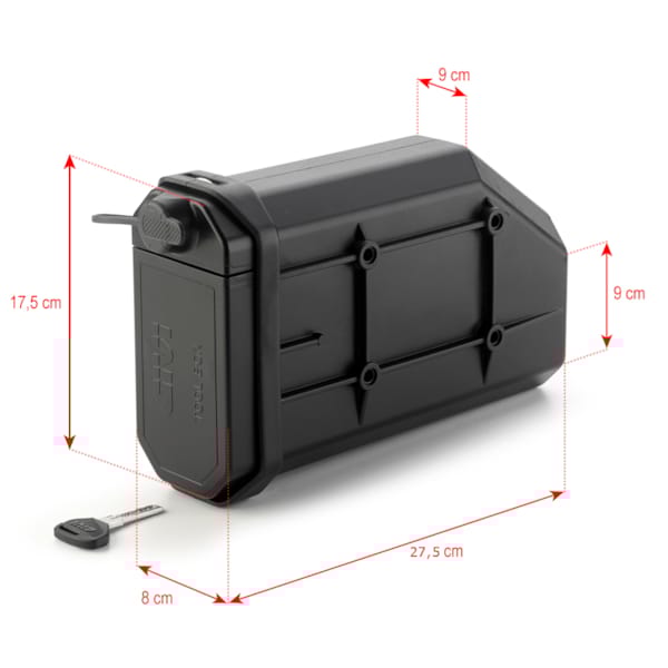 Afmetingen van de box bedragen (lengte) 275 x (breedte) 90 x (hoogte) 170 mm, wat ruim volstaat voor het essentiële gereedschap. Motorrijden en –reizen is overigens vooral een zaak van bepalen wat je niet zal meenemen.