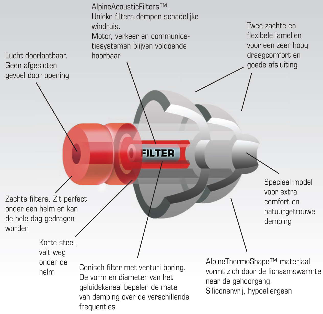 Al het bovenstaande wordt veroorzaakt door het geluidsniveau van windruis in de helm. Aan 120 kilometer per uur mag je rekenen op 98 dB, wat ergens tussen een wekker en een concert ligt. Niet te onderschatten dus en na 7 minuten is er al sprake van een risico op gehoorschade. Los van het feit dat je ook heel wat sneller vermoeid raakt in dergelijke omstandigheden. MotoSafe®-oordoppen dempen dat schadelijke geluid, zonder je het gevoel te geven dat je ergens in een aquarium zit. Het verkeer, de navigatie, de intercom en de motor zelf blijven voldoende hoorbaar, dankzij de innovatieve AlpineAcousticFilters™. Alpine slaagt er bovendien in de oordoppen zeer universeel te maken, waardoor ze in principe bij elke bestuurder passen. Het unieke model zorgt ervoor dat ze onder de helm aangenaam blijven aanvoelen én comfortabel zitten.