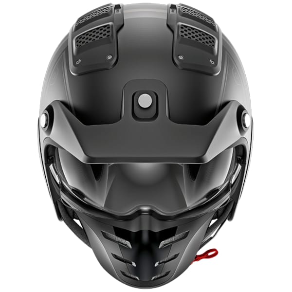 Echte ventilatieopeningen zoals bij traditionele integraalhelmen zijn hier overbodig, maar de X-Drak kreeg wel een zogenaamd ‘Low speed Ventilation system’, in de vorm van heel wat geperforeerde vlakken die effectief voor een licht – maar vooral luchtig – gevoel zorgen. Met een geïntegreerd zonnevizier en het extra kinstuk geef je het geheel niet alleen een ander uitzicht, qua bescherming tegen de elementen overstijgt dit de doordeweekse jethelm. Dat vizier is overigens krasvast, behandeld tegen mist en uitgerust met een quick release systeem. Standaard krijg je er ook de afneembare zonneklep bij.