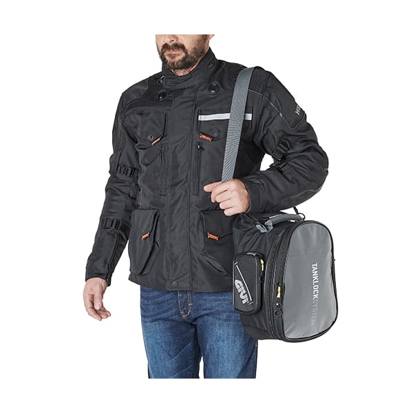 De Givi Enduro Easy-T is gemaakt uit stevig 600D polyester met verwijderbare pvc-verstevigingen. De aanwezigheid van een handvat laat toe om de tanktas probleemloos mee te nemen bij een tussenstop. Een meegeleverde schouderriem verandert de tas in een oogwenk in een rugzak/schoudertas. Reflecterende details vergroten de zichtbaarheid ’s avonds en ‘s nachts.