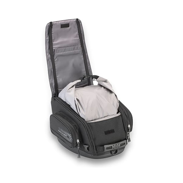 De ULTIMA-T-tanktas is voorgevormd en voorzien van een tanklockring. De aanwezigheid van een voorgevormd handvat en de meegeleverde, verstelbare schouderriemen zorgen ervoor dat je de tas bovendien makkelijk en praktisch verplaatst bij een eventuele tussenstop of op de eindbestemming. Inhoudelijk dan. Twee kleinere – dicht te ritsen en makkelijk bereikbare – opbergvakjes links en rechts laten je toe een aantal zaken dicht bij de hand te houden. Bovenaan kan je in het transparante opbergvak een kaart of tablet kwijt. Het is langs binnen te bereiken en dus waterdicht. Je krijgt bij de ULTIMA-T –tanktas bovendien een aparte, alweer waterdichte, transparante tablethouder extra. Het centrale opbergvak is niet opgedeeld. De interne waterdichte roltas kan je verwijderen. De twee trekkers zijn uitgerust om met een hangslotje op slot te kunnen.