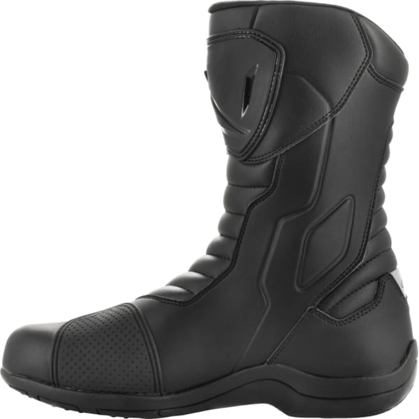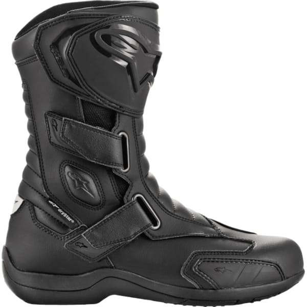 De buitenzijde is microfiber. Kunststof dus, maar dan wel de slimme variant, en met een focus op lange levensduur en scheur- en slijtvastheid. De Radon Drystar is gemaakt om een tijd mee te gaan. Een stevige scheenbeenplaat (TPU) en een subtiele teenslider (TPR) verraden de sportieve stamboom, terwijl een geïntegreerd Drystar-membraan – weapon of choice als het over waterdichtheid gaat bij Alpinestars – de touringcapaciteiten in de verf zetten.