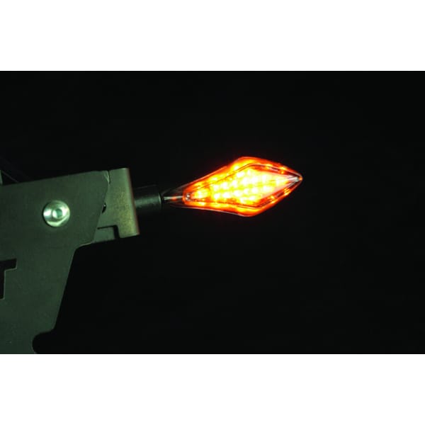 De Hunter richtingaanwijzers van CHAFT zijn een exclusief design. Deze mini-knipperlichtjes neigen naar een druppeltje extra agressiviteit op je motorfiets. De niet-flexibele steel, zwarte aluminium basis en de gefumeerde lens versterken dat alleen nog. Toch zijn ze duidelijk. Het is links of rechts. Punt. De oranje ledlampjes zijn talrijk aanwezig. Deze CE-gehomologeerde knipperlichten worden geleverd per paar, en zijn voorzien van kabel en moer.